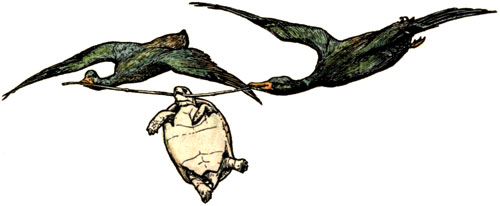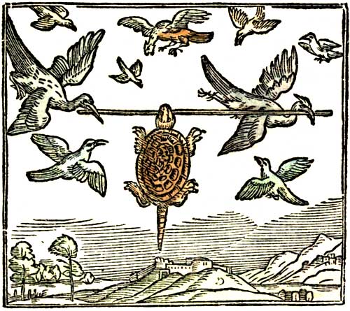 Parallels.—It occurs also in the Bidpai literature, in nearly all its multitudinous offshoots. See Benfey, Einleitung, §84; also my Bidpai, E, 4 a; and North's text, pp. 170-5, where it is the taunts of the other birds that cause the catastrophe: "O here is a brave sight, looke, here is a goodly ieast, what bugge haue we here," said some. "See, see, she hangeth by the throte, and therefor she speaketh not," saide others; "and the beast flieth not like a beast;" so she opened her mouth and "pashte hir all to pieces."