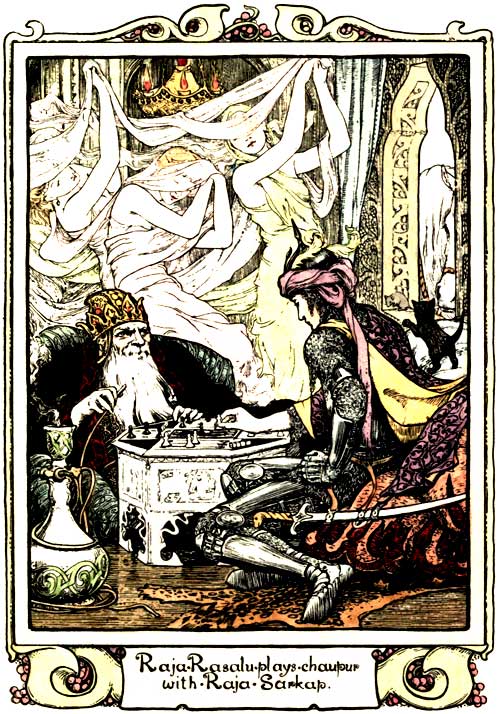 Source.—Steel-Temple, Wideawake Stories, pp. 247-80, omitting "How Raja Rasalu was Born," "How Raja Rasalu's Friends Forsook Him," "How Raja Rasalu Killed the Giants," and "How Raja Rasalu became a Jogi." A further version in Temple, Legends of[249] Panjab, vol. i. Chaupur, I should explain, is a game played by two players with eight men, each on a board in the shape of a cross, four men to each cross covered with squares. The moves of the men are decided by the throws of a long form of dice. The object of the game is to see which of the players can first move all his men into the black centre square of the cross (Temple, l. c., p. 344, and Legends of Panjab, i. 243-5). It is sometimes said to be the origin of chess.