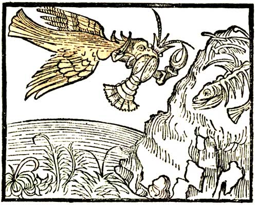 Remarks.—An interesting point, to which I have drawn attention in my Introduction to North's Bidpai, is the probability that the illustrations of the tales as well as the tales themselves, were translated, so to speak, from one country to another. We can trace them in Latin, Hebrew, and Arabic MSS., and a few are extant on Buddhist Stupas. Under these circumstances, it may be of interest to compare with Mr. Batten's conception of the Crane and the Crab (supra, p. 50) that of the German artist who illustrated the first edition of the Latin Bidpai, probably following the traditional representations of the MS., which itself could probably trace back to India.
