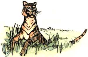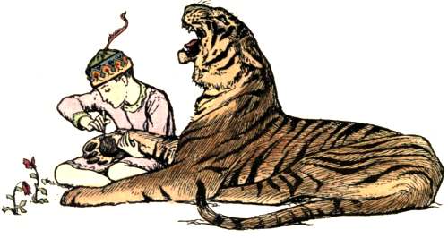 Then the prince took a little knife from his pocket, and cut the thorn out of the tiger's foot; but when he cut, the tiger roared louder than ever—so loud that his wife heard him in the next jungle, and came bounding along to see what was the matter. The tiger saw her coming, and hid the prince in the jungle, so that she should not see him.