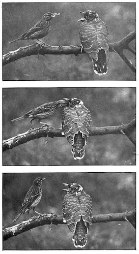 The study of our native song birds will be found to contain many delightful curiosities, and to present not a few entertaining problems. For instance, all our first-class melodists, such as the Nightingale, Song Thrush, Blackcap Warbler, Woodlark, and Garden Warbler, are dressed in the most sober of sober colours. Male migrants generally arrive upon our shores before the females, and at once commence to sing and practise all kinds of curious antics in order to attract the attention of their prospective brides when they arrive. Individual birds of the same species vary greatly in the quality of their songs, and nearly all the members of a species sometimes sing better in one part of the country than another. Birds are first-class plagiarists, and not only copy each other’s notes, but upon occasion actually improve the quality of the music they borrow. Some of them, such as the Chaffinch, practise their notes thousands of times per day, and a Song Thrush sings as many as sixteen hours out of the twenty-four.