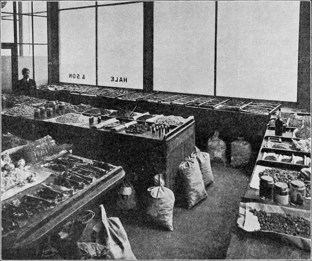 Bereits bei DIOSCURIDES finden sich Angaben über Aufbewahrung. «Für die flüssigen Arzneien eignet sich ein durch und durch dichter Behälter aus Silber, Glas oder Horn verfertigt, auch ein irdener, nicht poröser ist dazu passend und ein hölzerner, wie er besonders aus Buchsbaum verfertigt wird. Die erzenen Gefäße sind angebracht für Augen- und feuchte Mittel, besonders für solche, die aus Essig, aus Teer und Cedernharz bereitet sind. Fette und Mark müssen in Zinngefäßen aufbewahrt werden.» — «Weiterhin muß man wissen, daß einige Pflanzenmittel viele Jahre sich halten, wie die weiße und schwarze Nießwurz, die übrigen zumeist auf drei Jahre hin brauchbar sind.» — «Man muß die reinen Wurzeln sofort an nicht feuchten Orten trocknen, die mit Erde oder Lehm behafteten in Wasser abwaschen, die Blüten aber und was Wohlgerüche enthält in trockenen Kästen von Lindenholz aufbewahren. Manches gibt es, was vorteilhaft in Papier oder Blätter eingehüllt wird zur Erhaltung der Samen.»