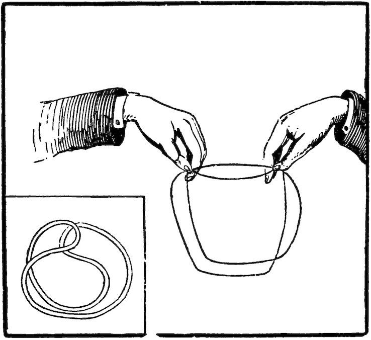 He then places the coin in the centre of the handkerchief, and puts it over the mouth of the glass, where the volunteer holds it by its edge through the silk, so that the pendent corners hide the coin and glass.