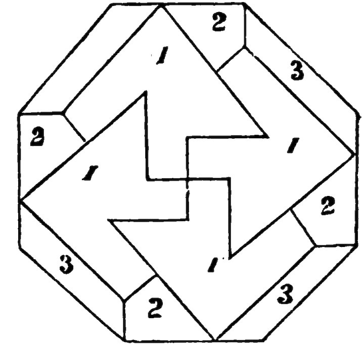The success of the trick depends on their being exactly alike in size. Place a sixpence in the centre of one of the pieces at the place marked A, then fold it carefully over at the crease on the side marked B, and also again at the side marked C. When you have done this, turn down the end marked D upon the centre A and again fold over on E. You have thus formed a small parcel the shape of Fig. 8, with a sixpence in the middle. You must then put a shilling in the centre of the other piece of paper, and fold it up exactly the same 23size and shape as the first piece. When you have done this, paste the two parcels together at the back of the ends marked F in Fig. 8, and the sides will be so even that both will appear as one. You can then open the side of the paper containing the smaller coin, and show it to your audience, at the same time informing them that you are going to open a mint on a small plan, and coin a shilling from a sixpence. Dexterously turn over the side containing the shilling, and upon opening the paper, to the general astonishment, instead of a sixpence they will behold a shilling.