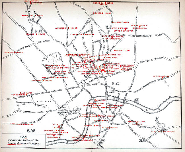 In the following pages an attempt has been made to write, for the first time, a history of the London pleasure gardens of the last century. Scattered notices of these gardens are to be found in many histories of the London parishes and in other less accessible sources, and merely to collect this information in a single volume would not, perhaps, have been a useless task. It is one, however, that could not have been undertaken with much satisfaction unless there was a prospect of making some substantial additions—especially in the case of the less known gardens—to the accounts already existing. A good deal of such new material it has here been possible to furnish from a collection of newspapers, prints, songs, &c., that I have been forming for several years to illustrate the history of the London Gardens.[1]