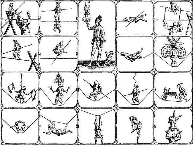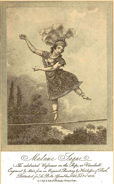 [358] Among the curious characters of Vauxhall Gardens must be noticed a youth named Joseph Leeming, who called himself “the Aeriel” and “the Paragon of Perfection,” and offered himself for inspection to artists and surgeons as a model of bodily perfection. On 2 July, 1825, and on subsequent occasions he mingled with the other visitors at Vauxhall and created excitement by his extraordinary Spanish costume and by distributing three or four hundred “Challenges” to the people in front of the orchestra. One of these curious challenges is in my collection. It is a small card printed with the words “The Aeriel (sic) challenges the whole world to find a man that can in any way compete with him as such. No.—.” (cp. Hone’s Every Day Book, i. p. 1456, ff.).
