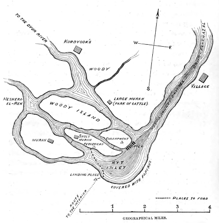 Here, then, I was upon the very bank of the river, attesting the western flow of the water, about which the contradictions and inconsistencies of the Nubians had kept up my unflagging interest ever since we set out from Khartoum. Whoever has any acquaintance with the indistinctness that ever attaches to the statements of those who would attempt to describe in Arabic the up-current of the down-current of a river will readily comprehend the eagerness with which I yearned to catch the first glance of the waters of which the rippling sound, as they washed their stony banks, came through the bushes to my a strained and listening ear. If the river should flow to the east, why then it solved the problem, hitherto inexplicable, of the fulness of the water in Lake Mwootan; but if, as was far more likely, it should go towards the west, then beyond a doubt it was independent altogether of the Nile system. A moment more and the question was set at rest. Westerly was the direction of the stream, which consequently did not belong to the Nile at all; it was in all likelihood not less than 180 miles distant from the most western coast of Lake Mwootan, and at the numerous rapids which are formed in its upper course it rises almost to the level of the lake, even if it does not attain a still higher altitude.[50]