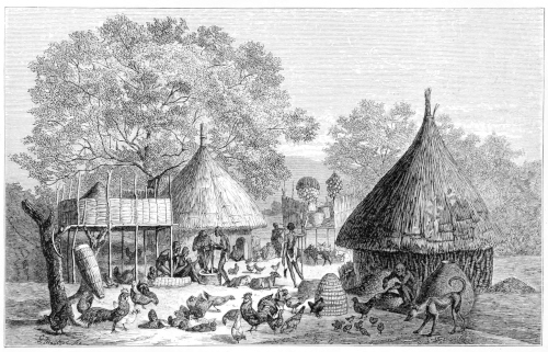 After taking some brief repose on the frontier of the new country, followed by troops of men and women, we proceeded to the residence of Nembey, a local chieftain under King Degberra, who governs the eastern half of the Monbuttoo, whilst the western portion belongs to Munza, a sovereign who rules with a still more powerful sway. The abode of Nembey was situated on a rivulet called the Kussumbo, which rolls on its crystal waters in a deeply-hollowed channel to join the Kahpily. Crossing the stream, we encamped upon some slightly undulated ground, encompassed by low bushes, where we erected some grass-huts that should be perfectly rain-proof. Immediately upon our arrival, Nembey accompanied by a number of his wives, paid me a visit in my tent, and brought me a present of poultry.