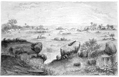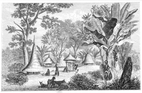 The order for the halt was no sooner given than the bearers set about their wonted work, and labouring with their knives and hatchets soon procured from the jungles by the brook the supply of material sufficient for our architectural needs. Rapidly as ever our encampment was reared: hardly an hour elapsed before our place of sojourn was in order, with a gorgeous landscape opening in its front, and this time in[Pg 559] view of the royal abode of an African monarch. My own tent, which began to exhibit only too plainly the tokens of being somewhat weather-beaten by repeated exposure, was located in the very midst of the lines of our grass-huts: not now was it erected, as often it had been, upon the bare rock of a desolate wilderness, but in the centre of a scene of surpassing beauty: for the first time I had it decorated with my flag, which waved proudly above it in honour of our arrival at the court of so distinguished and powerful a prince.