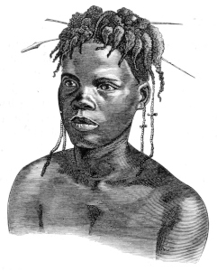 Since Madame Bongwa only intended to pay me a short visit, she did not appear en grande tenue; the picture, therefore, necessarily failed in the black figures which, for full dress were painted on her ample flanks, and which would have given a double interest to the likeness. As a token of my recognition of the steadiness with which she sat during my artistic labors, I permitted her (and this was the greatest the privilege I could afford any of the natives) to put her fingers through my hair, which to her eye was so astonishingly long and sleek.