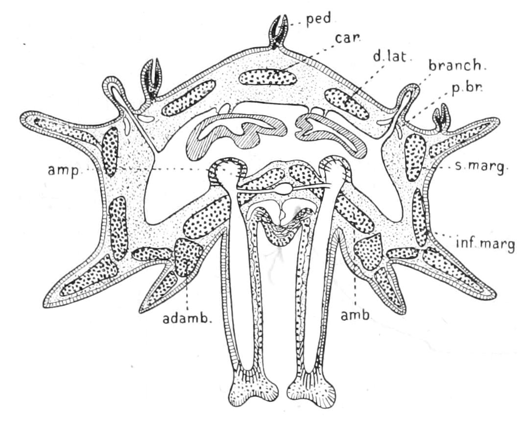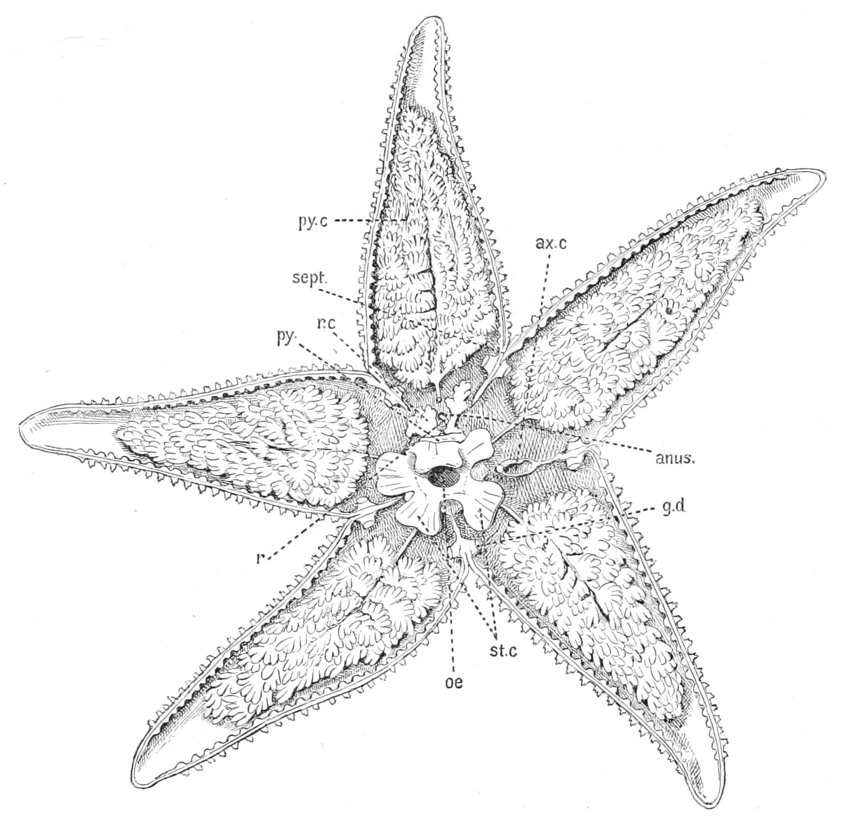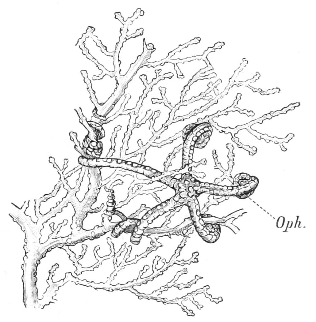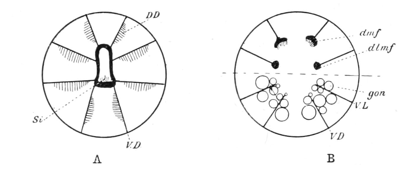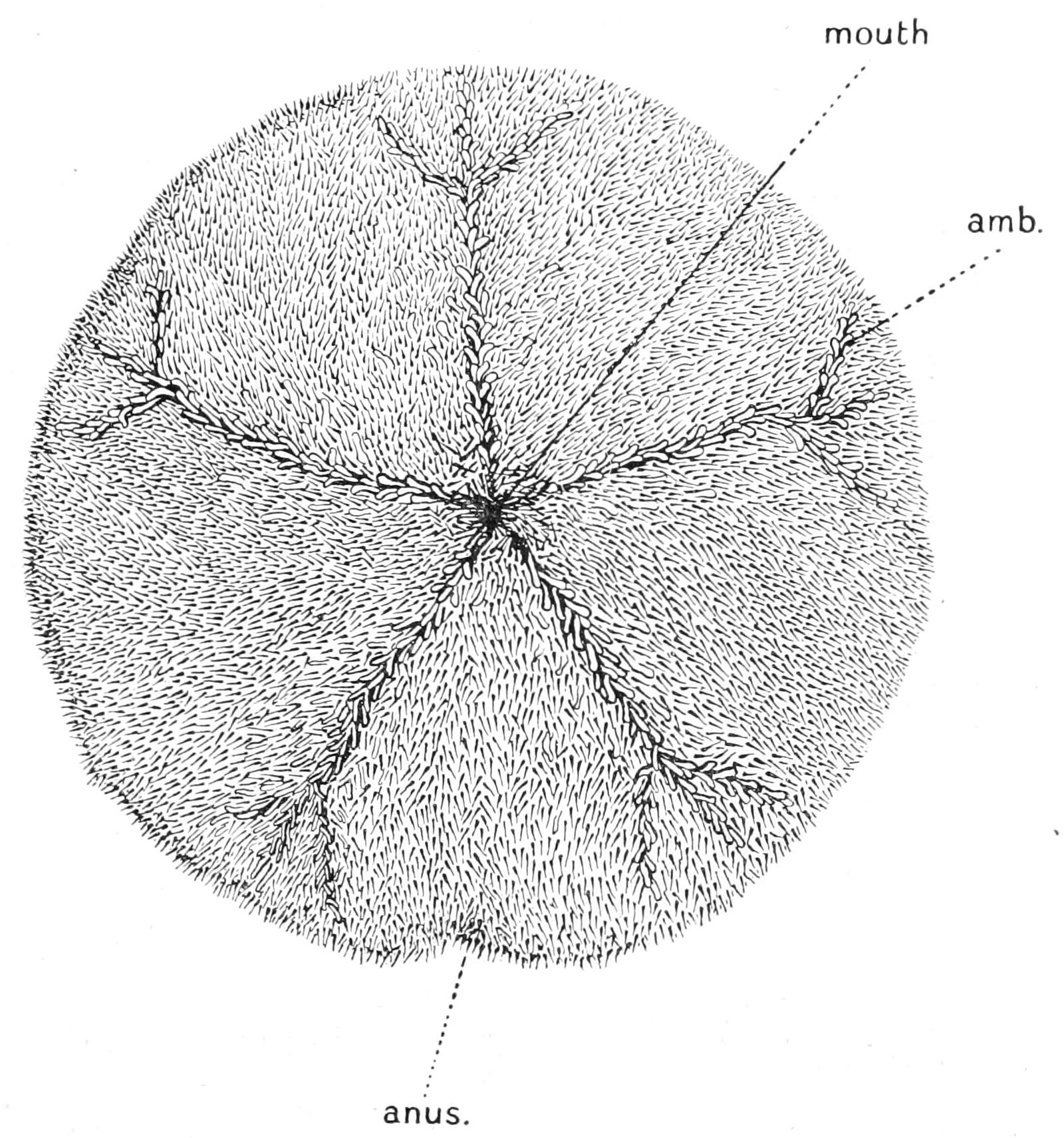 The analogy of Echinoidea (see p. 529) might suggest that, like the lacteals in man, these strands were channels along which the products of digestion diffused outward. No connexion, however, between the oral ring and the alimentary canal has been made out, nor do there appear to be such strands developed in the proximity of the wall of the digestive tube. A connexion between the aboral ring and the rectum through a mesenteric cord has been asserted, but this is doubtful.