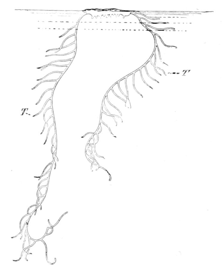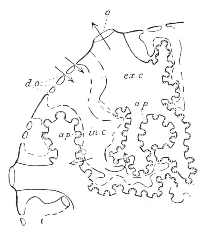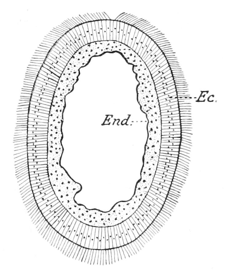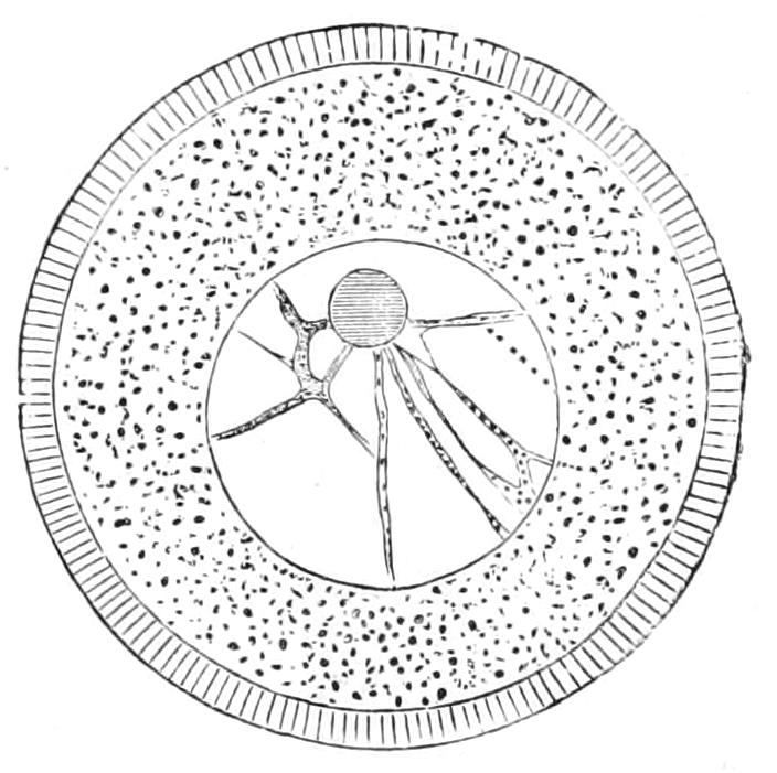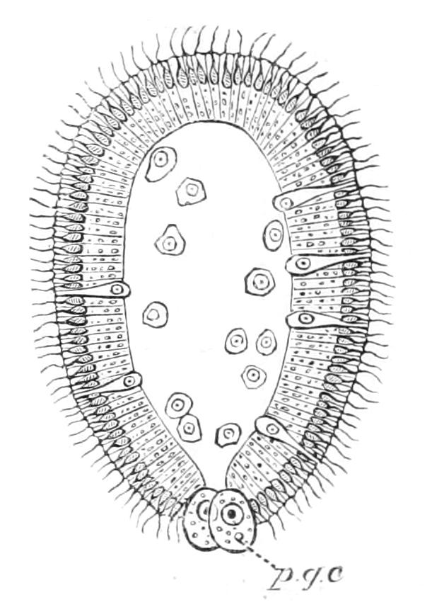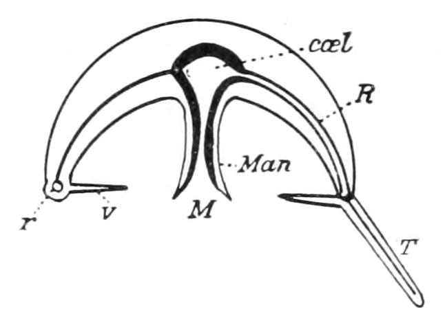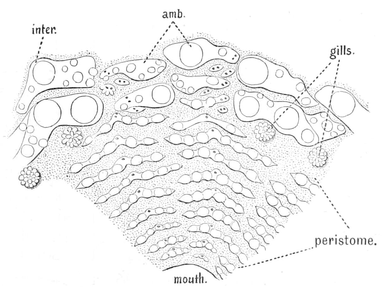 The analogy of Echinoidea (see p. 529) might suggest that, like the lacteals in man, these strands were channels along which the products of digestion diffused outward. No connexion, however, between the oral ring and the alimentary canal has been made out, nor do there appear to be such strands developed in the proximity of the wall of the digestive tube. A connexion between the aboral ring and the rectum through a mesenteric cord has been asserted, but this is doubtful.