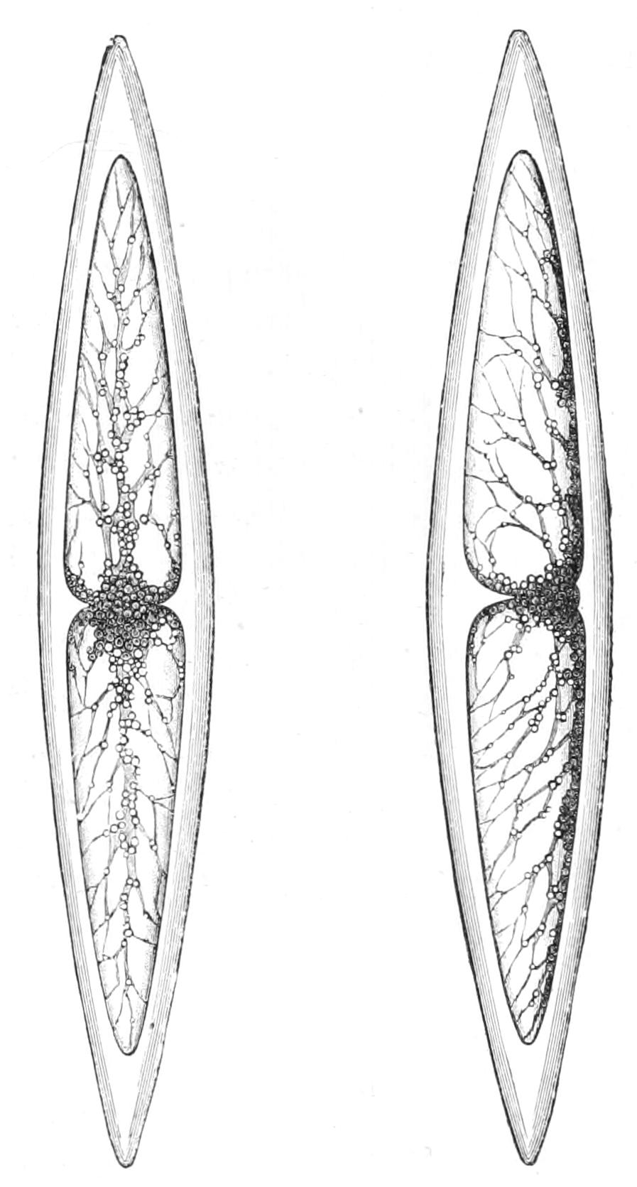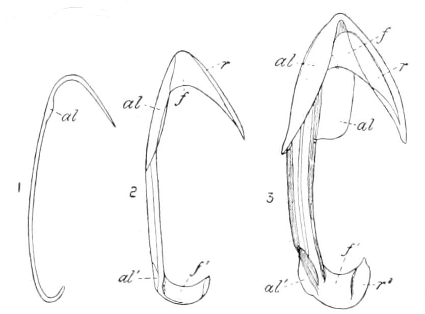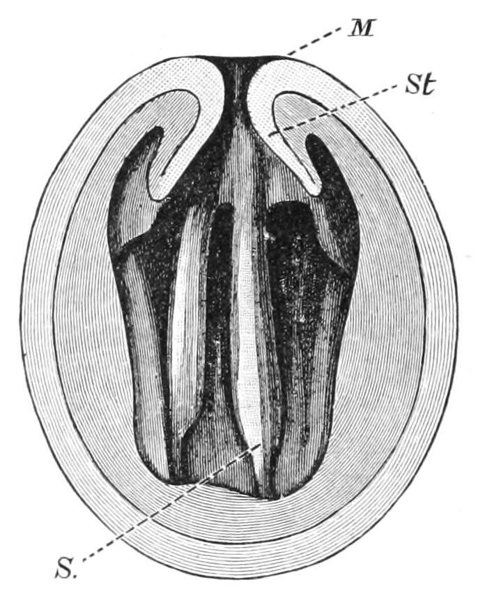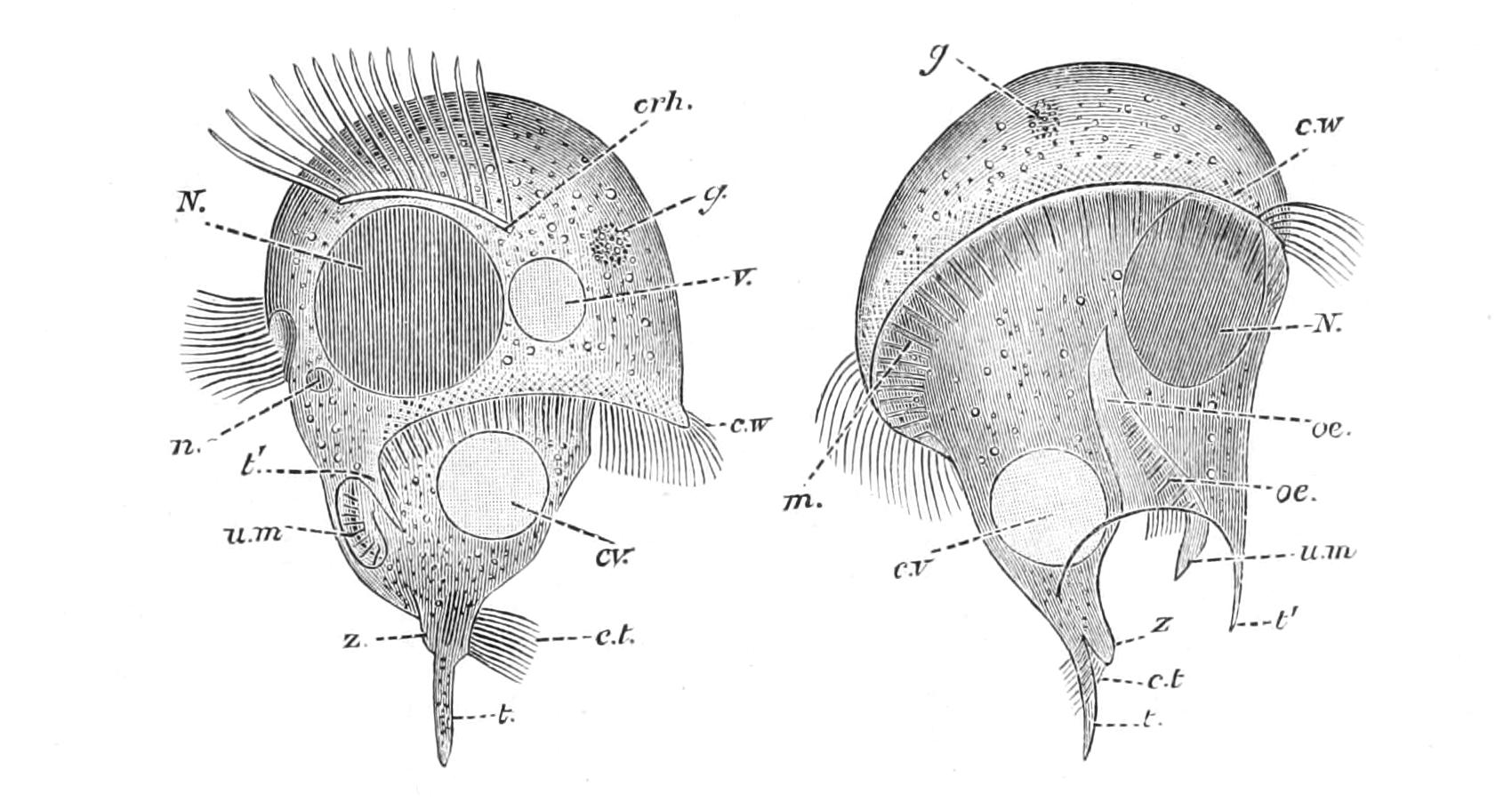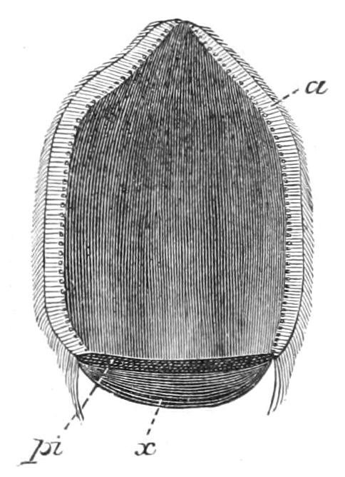 The two costae that are seen in the middle when the Ctenophore is viewed in the transverse plane, as in Figs. 180 and 181, and the corresponding costae on the opposite side are called the "transverse" costae; the other four are called the "sagittal" costae.
