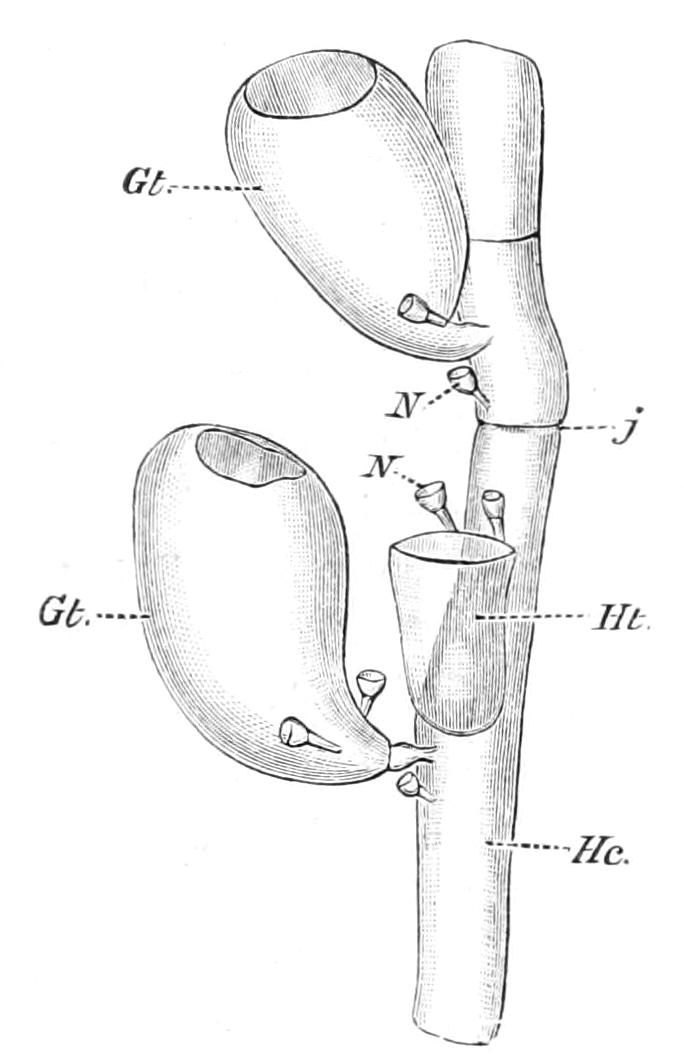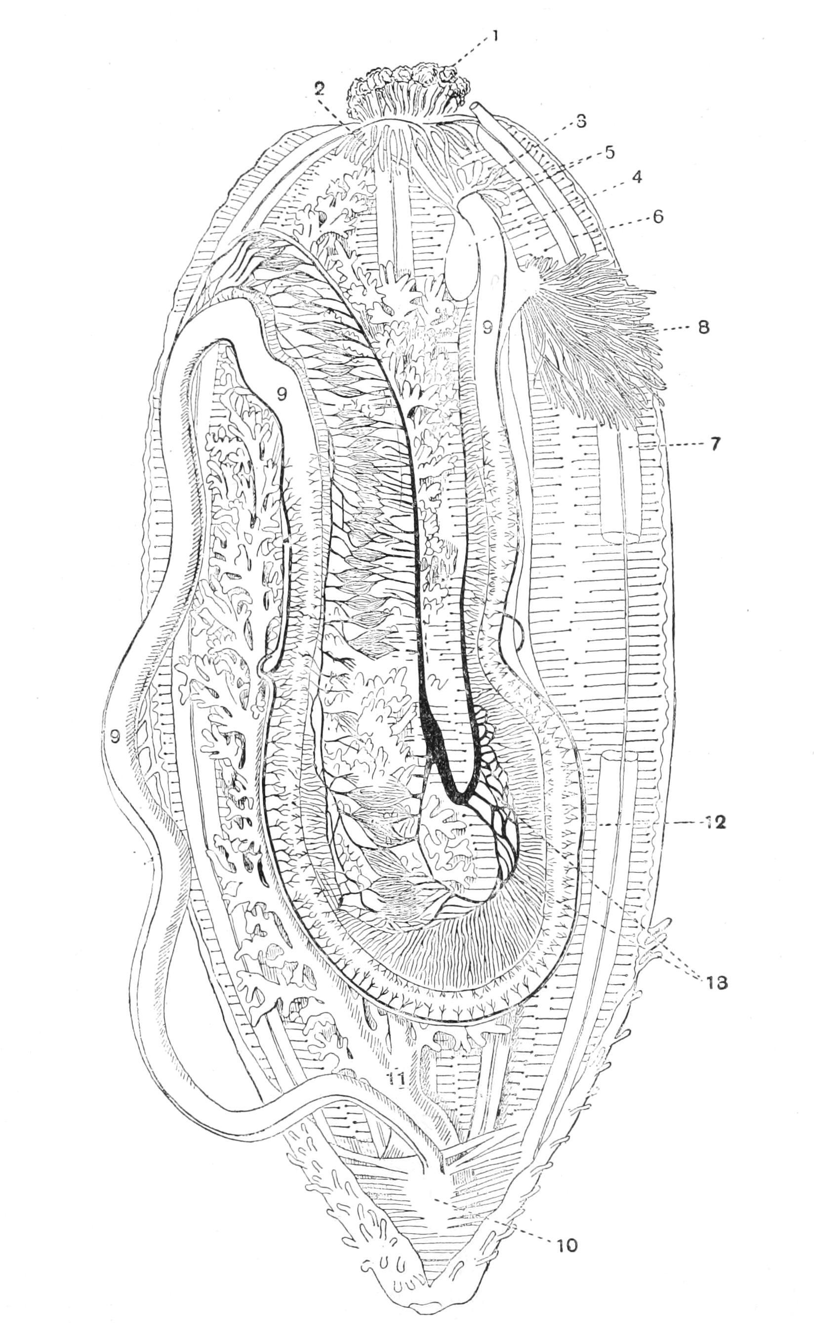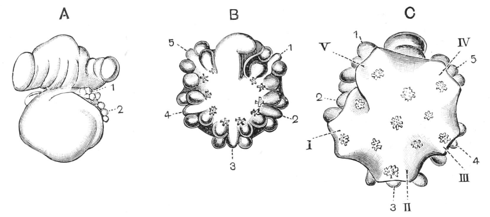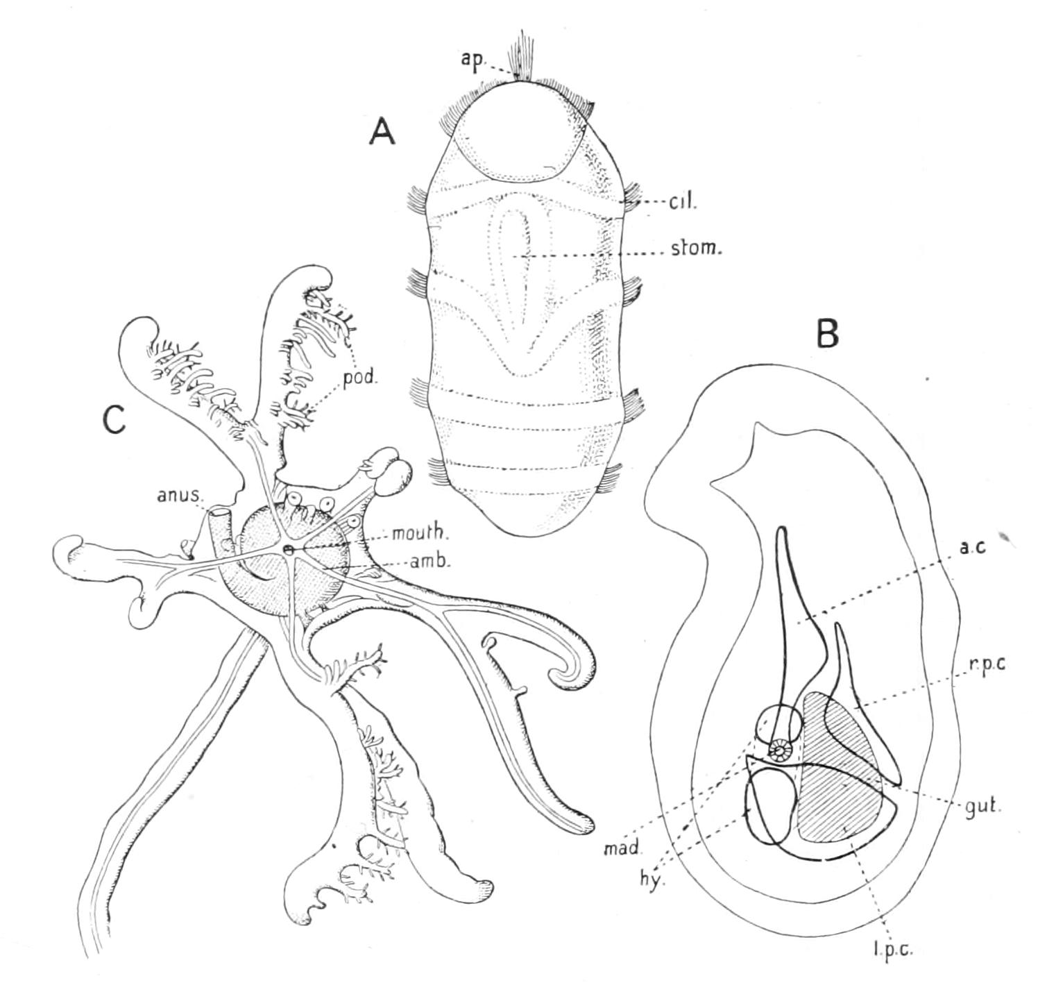 In the type figured (larva of Synapta digitata) the feelers are budded off directly from the ring-canal and alternate with the rudiments of the radial canal.