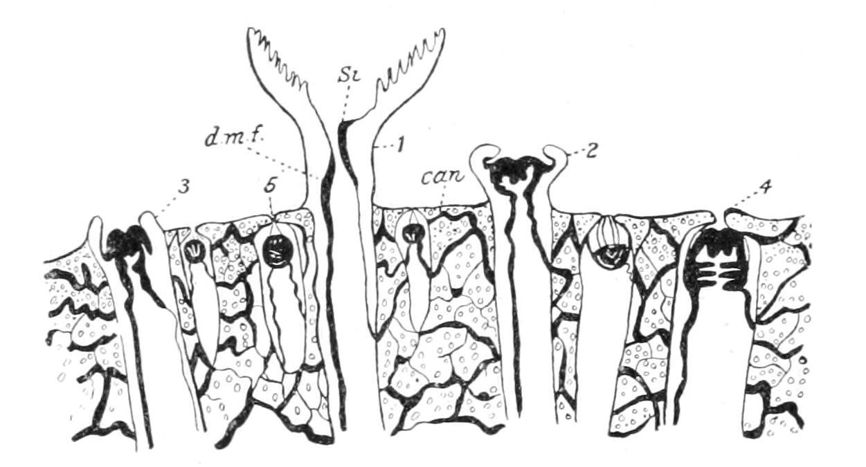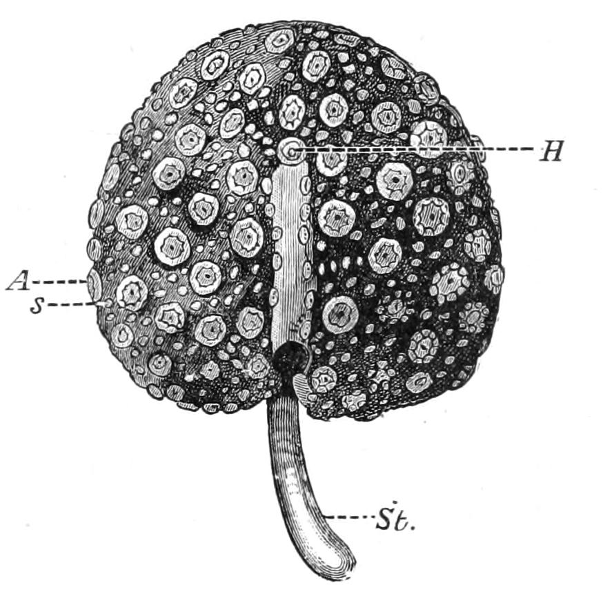 In this case the fluid flows from the lantern coelom into Stewart's organs and vice versa. Oxygen must be absorbed through the peristome. The Cidaridae are not as sensitive to want of oxygen as the other families (Uexküll, loc. cit.).