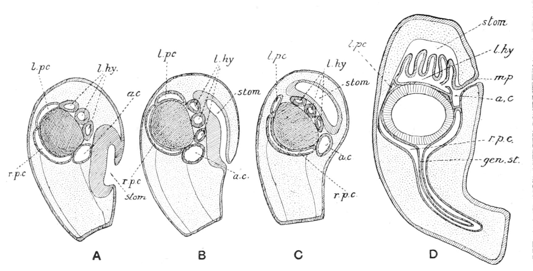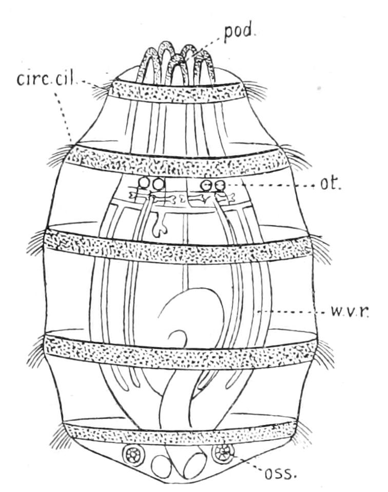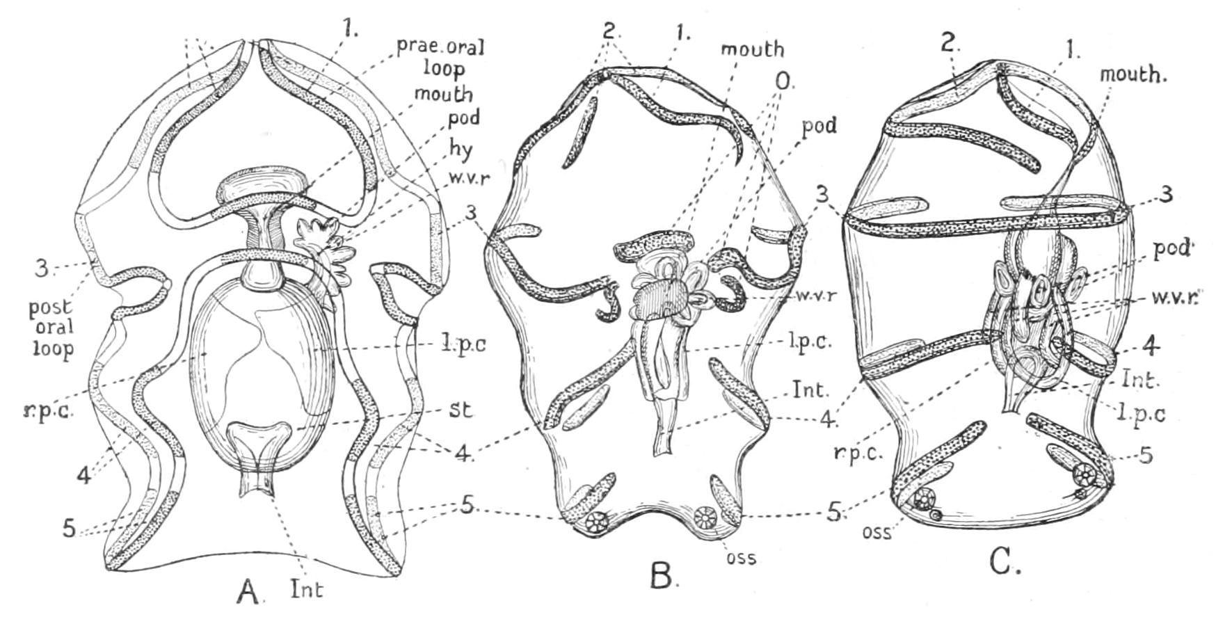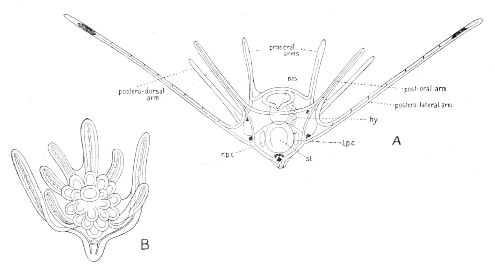 This is clearly seen by comparing the larva of Asterina gibbosa with a young Bipinnaria in which the longitudinal band is as yet undivided. The shape of the prae-oral lobe is practically the same in both.