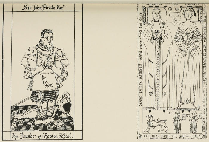 “Sʳ John Port, Knight, son of Sʳ John Port, one of the Justices of the Court of King’s Bench, haueing by his last Will left an Estate for the Erection and Endowment of a Free Schole at Repton and an Hospital in this place, departed this Life June VI. MDLVII. the which Foundations hauveing been accordingly established, this Hospitall, through length of time falling to decay, was rebuilt, the Sallary’s increased, the Alms Men augmented from VI. to XII. The Right Honourable Theophilus Earle of Huntingdon, the Right Honourable Philip Earle of Chesterfield, and Sʳ William Gerrard, Barronet, Heires Generall to the Founder, being Governors, MDCLXXXI.”