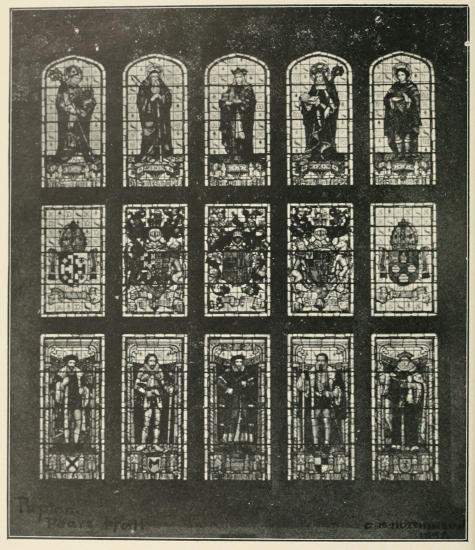 There are several monuments in memory of the Porte family. The oldest one is a brass in memory of Henry Porte, and Elizabeth his wife, and used to be on the floor of the chapel. It has been taken up, and used to block up a door on the north side of the chancel. Only the matrix of the brass of Henry is left, but his wife, clad in conventual dress adopted by widows, and his children, nine sons and eight daughters, remain. At the upper corners of the brass are two shields, one bearing a figure of our Lord, with the “orbs mundi” in His left hand, and the other the Blessed Virgin, and Child. Of the two shields at the bottom one bears the arms of Porte, the other has been taken away. Below, on a brass scroll, is an inscription:—