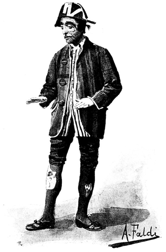 Most plays of this description partook rather of the character of farce than of legitimate comedy. The principal personages—Harlequin, Columbine, Pantaloon, Coviello, Scaramouch, etc.—who make their appearance in every one, had certain fixed traditional costumes and masks, which were never departed from. The familiar figure of Punch, which has been so completely naturalised as to appear one of the most English of all English institutions, was handed down through many generations of Italian players before he reached our shores. As “Pulcinella” or “Polecenella” he is a typically Neapolitan figure; while Stenterello, another favourite mask, is as typically Tuscan. The name is supposed to be derived from “Stentare” (to be in great want)—the Tuscans, and more especially the Florentines, being famous throughout the Peninsula for economy—not to say meanness—which is a prominent feature in Stenterello’s character.