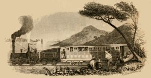 There are many pretty villas along the road; breathing places for the heated citizens below, which I would describe to you; but dashing along at sixteen miles an hour speed I can only catch a glimpse of white pillar and portico when the next minute we are three miles away. You must expect no description of the country when I am on a rail road, for the scenery is all blurred, like a bad lithograph. I only saw groups of pine trees rushing past and several bright dots which I suppose meant wild flowers when we came in sight of Schenectady, an antique dutch town. Before entering it I was struck by the vision of two immense tarred ropes walking deliberately beside our car, and discovered we were upon an inclined plain, descending which, cars of stone were brought up at the other end of our ropes. Our steam horse was once more exchanged for one of flesh and we set off upon a jog trot. Near the city we passed a canal basin in which lay several canal boats, for the Erie Canal passes through here. We entered the city, crossed the end of a long street filled with bright looking shops, where people and horses were frisking about in the morning air,—when another large depot received us in its barn-like expanse. The Ballston and Saratoga train entered at the other end, and you may imagine the charming confusion as the people of both trains jumped in and out the carriages, marched and counter marched until they had settled down into their several seats.{27}
