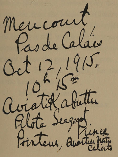 Star, won for being cited in L’Ordre du Jour of his Division for having been the only one of twenty-five aviators to reach Douai in 1915.