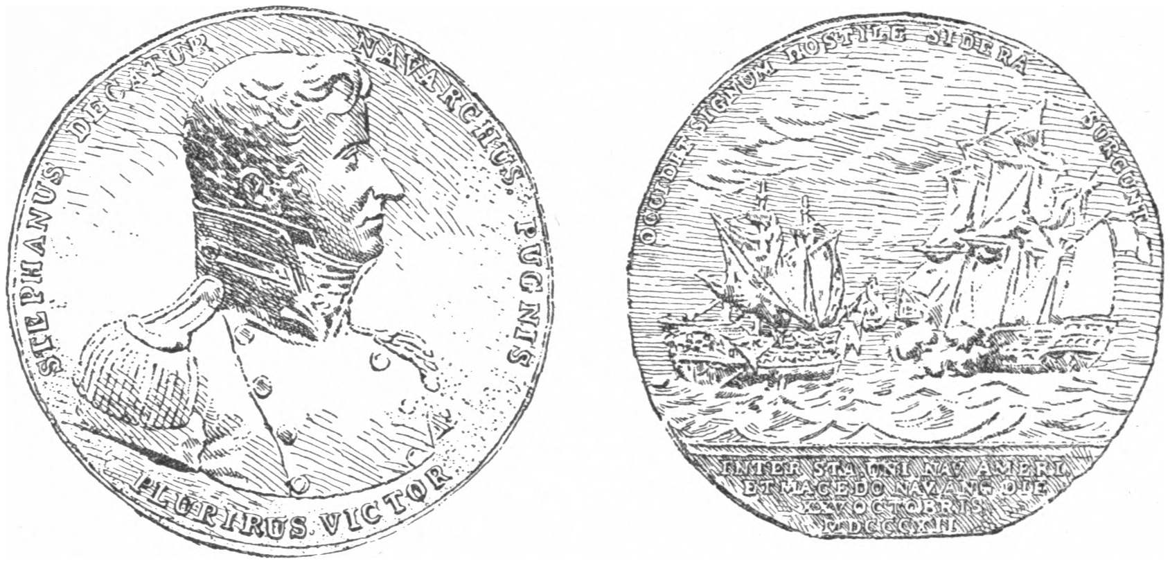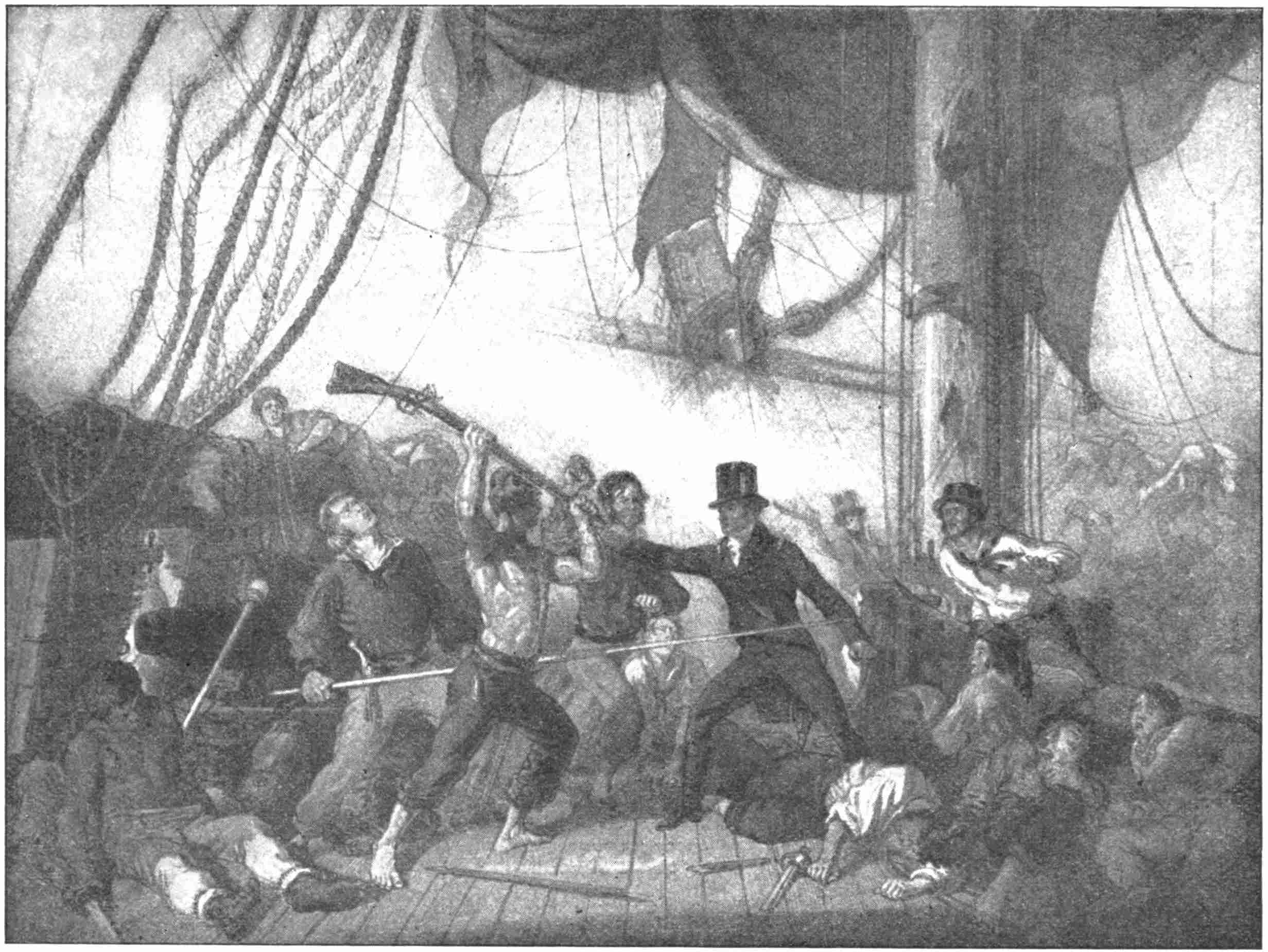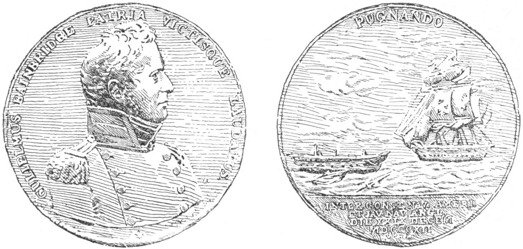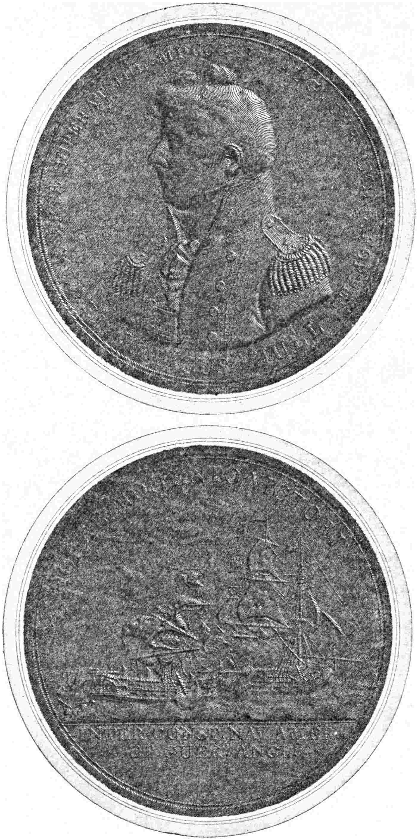 It is worth noting that on a considerable number of occasions during this war the Englishmen gave no quarter—it is worth noting as showing how greatly they were exasperated by their numerous defeats afloat. Indeed, after Barney’s attack on the Loire and Narcissus, British sailors (who were, it must be remembered, commanded by Admiral Sir George Cockburn), in their landing parties, not only robbed the defenceless citizens, but assaulted the women who happened to fall into their hands. And when they captured Washington,419 they not only destroyed such property as might be destroyed legitimately, but they repeated the universally execrated crime of Alexandria—they repeated the crime of which the fanatical priests of Spain were guilty among the civilized people of Yucatan—they deliberately burned the national library. The Knighted Admiral with his own hands took part in this work of destruction. Allen honors this British officer with a full-page engraving, in his history of the British Navy, only fifteen others being so distinguished in Volume II. of that work.