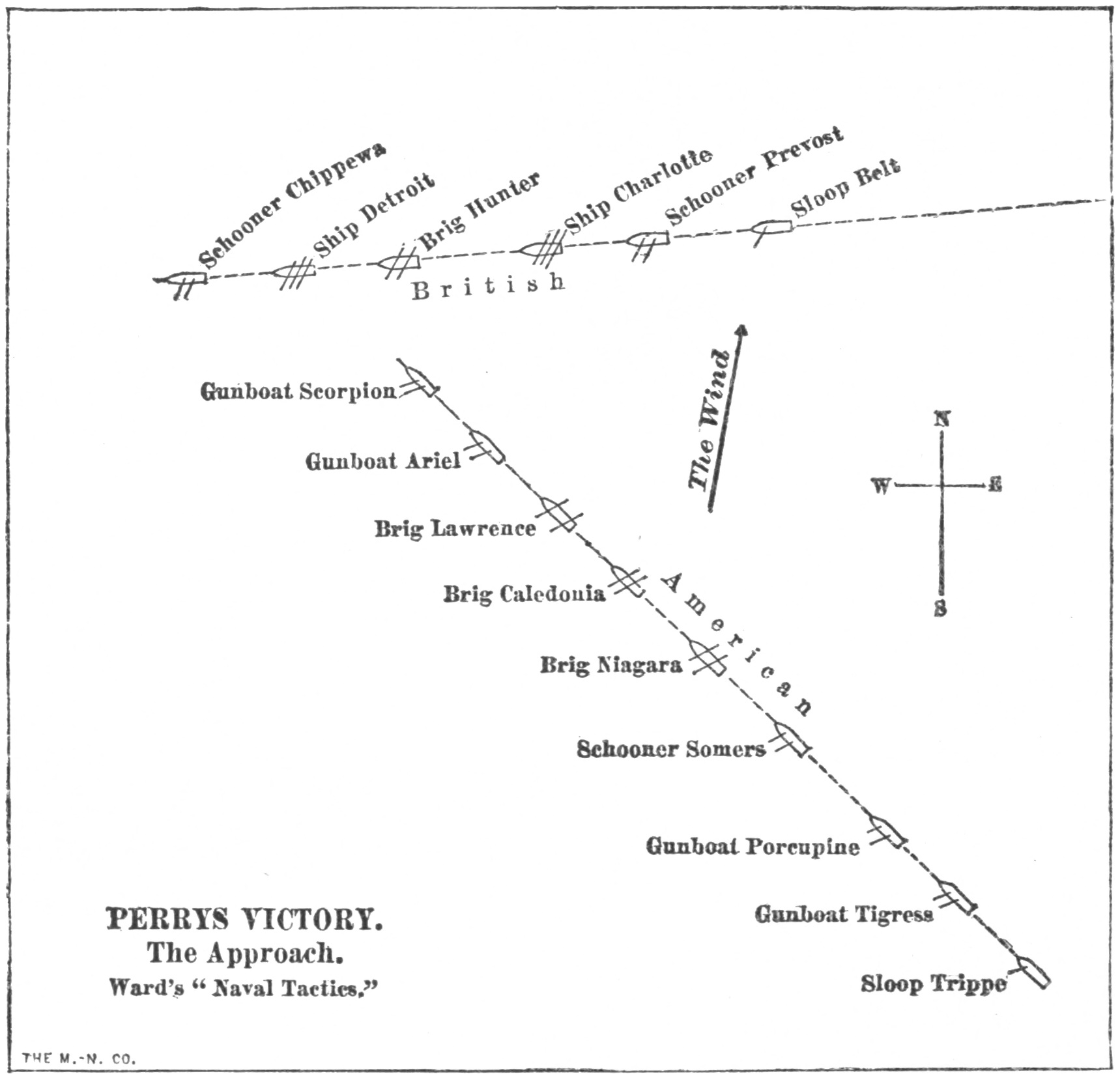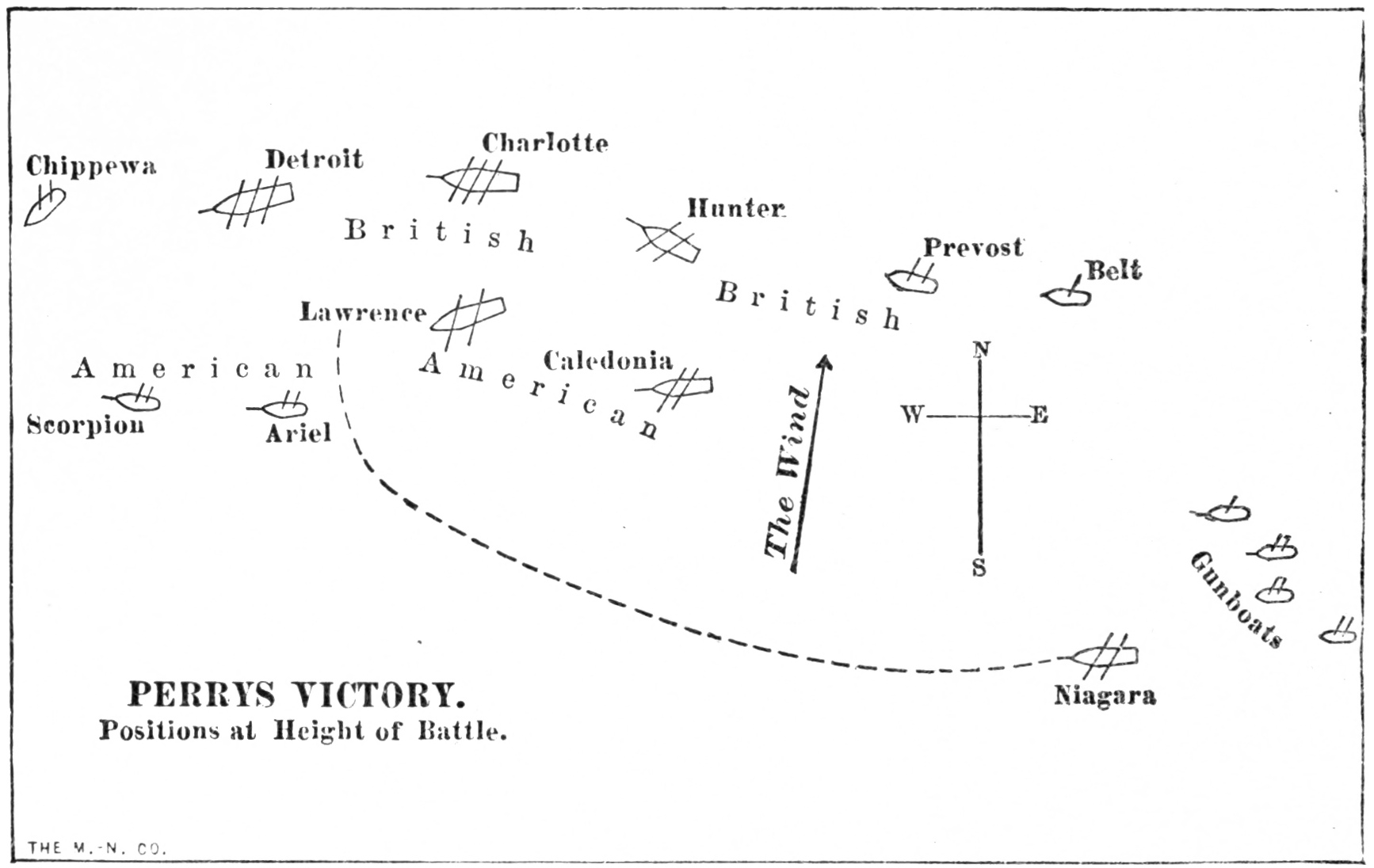 | Building War-ships and Gun-boats in the Wilderness—Lifting the Vessels over a Sand-bar—Fortunately the British Commander was Fond of Public Entertainments—The two Squadrons and their Crews Compared—The Advantage of a Concentrated Force was with the British—On the Way to Meet the Enemy—“To Windward or to Leeward they shall Fight To-day”—The Anglo-Saxon Cheer—The Brunt of the Fight Borne by the Flag-ship—A Frightful Slaughter there in Consequence—When Perry Worked the Guns with his own Hands, and even the Wounded Crawled up the Hatch to Lend a Hand at the Side-tackles—An Able First Lieutenant—Wounded Exposed to the Fire when under the Surgeon’s Care—The Last Gun Disabled—Shifting the Flag to the Niagara—Cheers that were Heard above the Roar of Cannon—When the Wounded of the Lawrence cried “Sink the Ship!”—Driving the Niagara through the British Squadron—The White Handkerchief Fluttering from a Boarding-pike—“We have Met the Enemy, and they are Ours.” | |