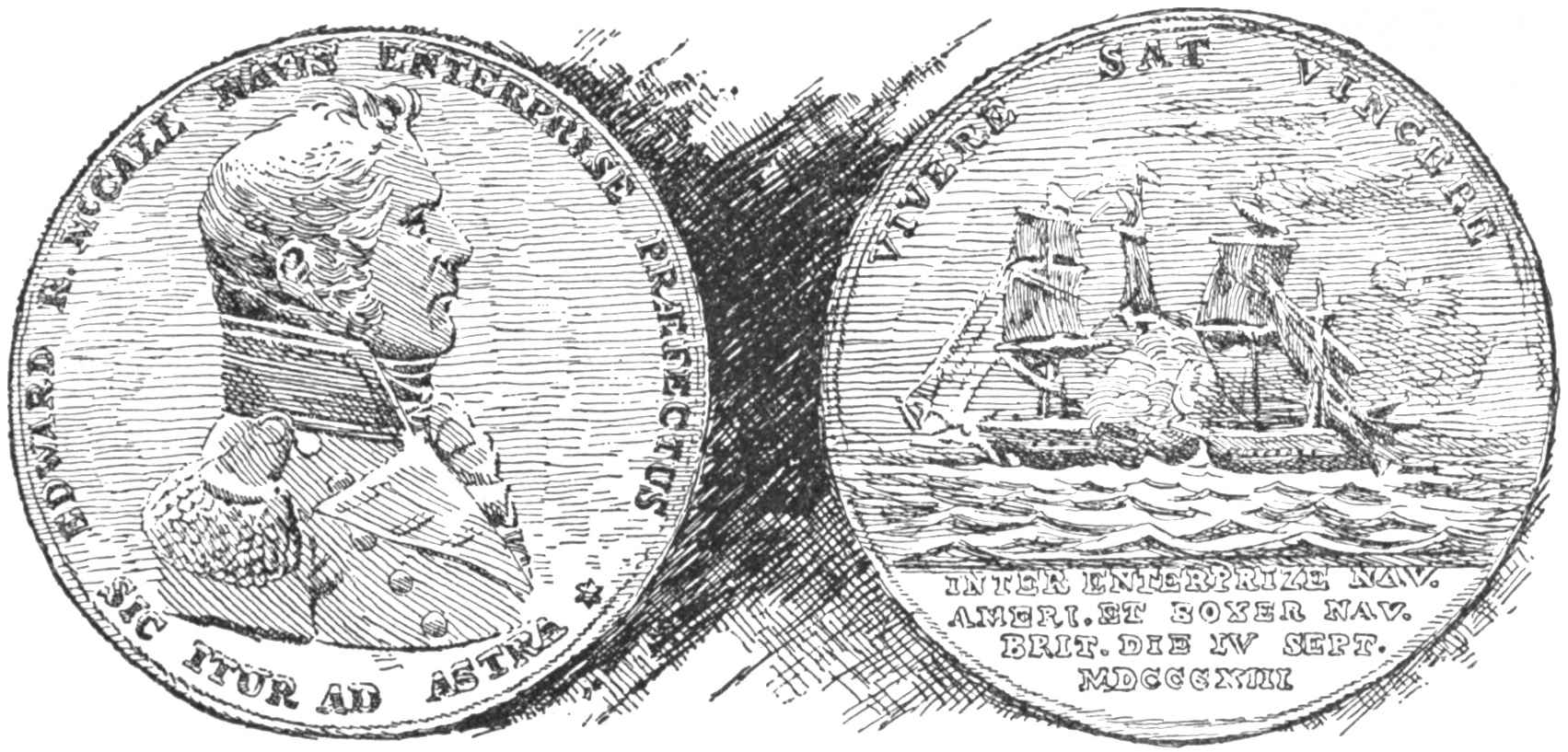 A small-boat fight well worth a paragraph occurred on June 12, 1813, in Chesapeake waters, when all the boats of the British frigate417 Narcissus were sent, under Lieutenant Cririe, to attack the little United States schooner Surveyor, commanded by Sailing master William S. Travis, who had but fifteen men and boys, all told, under him. The Surveyor was lying in York River at the time. The attack was made at night, and the guns of the schooner were useless, because the enemy came at her from points where broadside guns could not be made to bear. Nevertheless, Mr. Travis defended his ship, holding his fire of small-arms until the British were within a few yards. The one discharge killed three of the enemy and wounded seven, a remarkably deadly fire for night-work—but the British host came on, and before the American weapons could be reloaded, the weight of numbers overpowered the gallant little crew. Lieutenant Cririe was so impressed by the bearing of the Americans that he returned the sword of Travis with a highly complimentary letter.