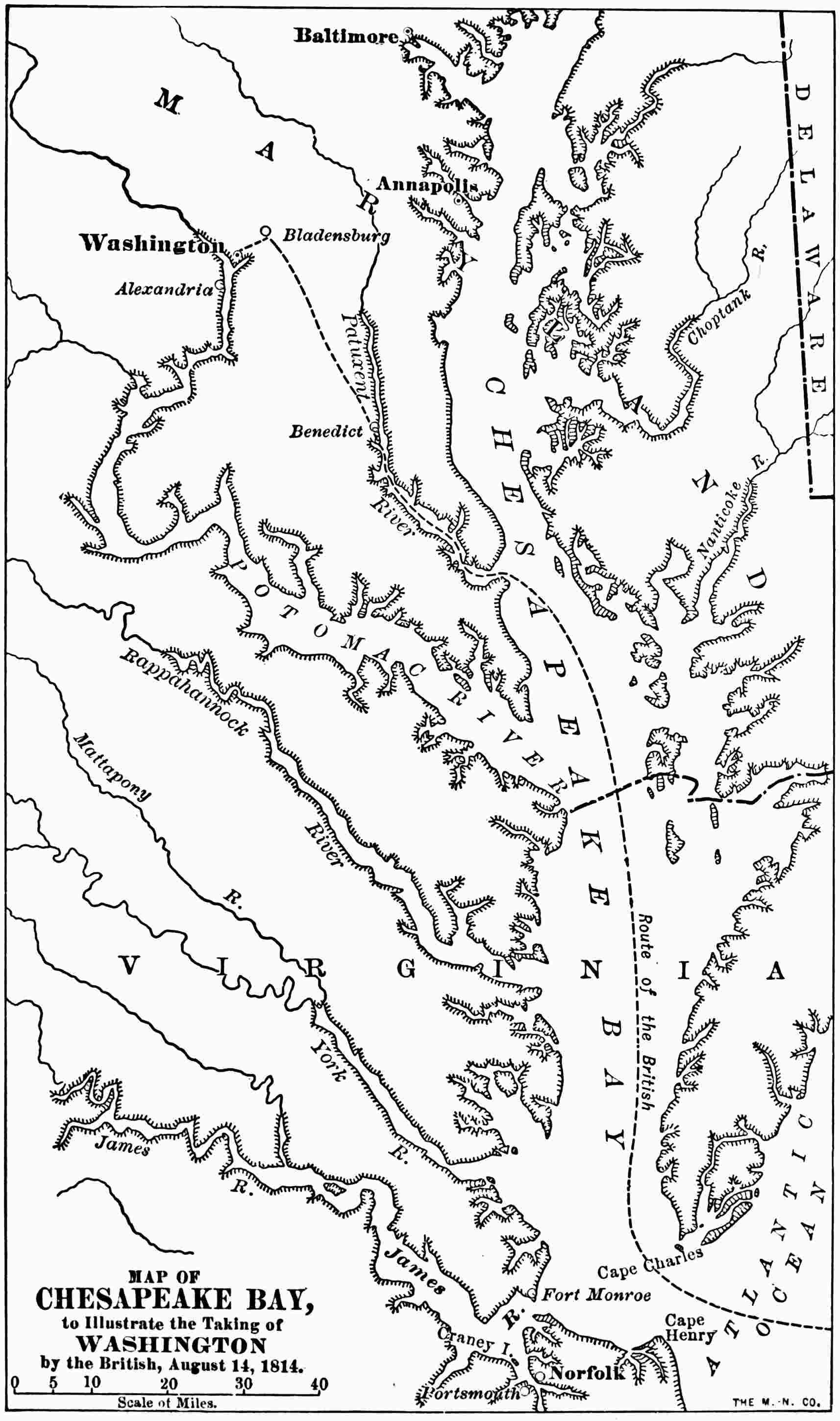 The above quotations are from Mary Barney’s “Memoir of Commodore Barney.” The British were driven away for the time, but they returned in August, having determined to attack the American capital. Under orders from Washington Captain Barney burned his fleet, and with his men, some four hundred in number, joined the army assembled to defend the416 capital. They made the best fight of any body of men there when the final fight came, and Barney received a wound from which he never fully recovered, although he lived several years longer. The new forty-four-gun frigate Columbia and the sloop-of-war Argus were burned on the stocks when Washington was taken by the British, besides the old condemned Boston and a lot of ship timber and naval stores. This was, of course, an entirely legitimate destruction. Had the gun-boats been one-half as efficient as their advocates supposed they were, Washington would not have been captured.