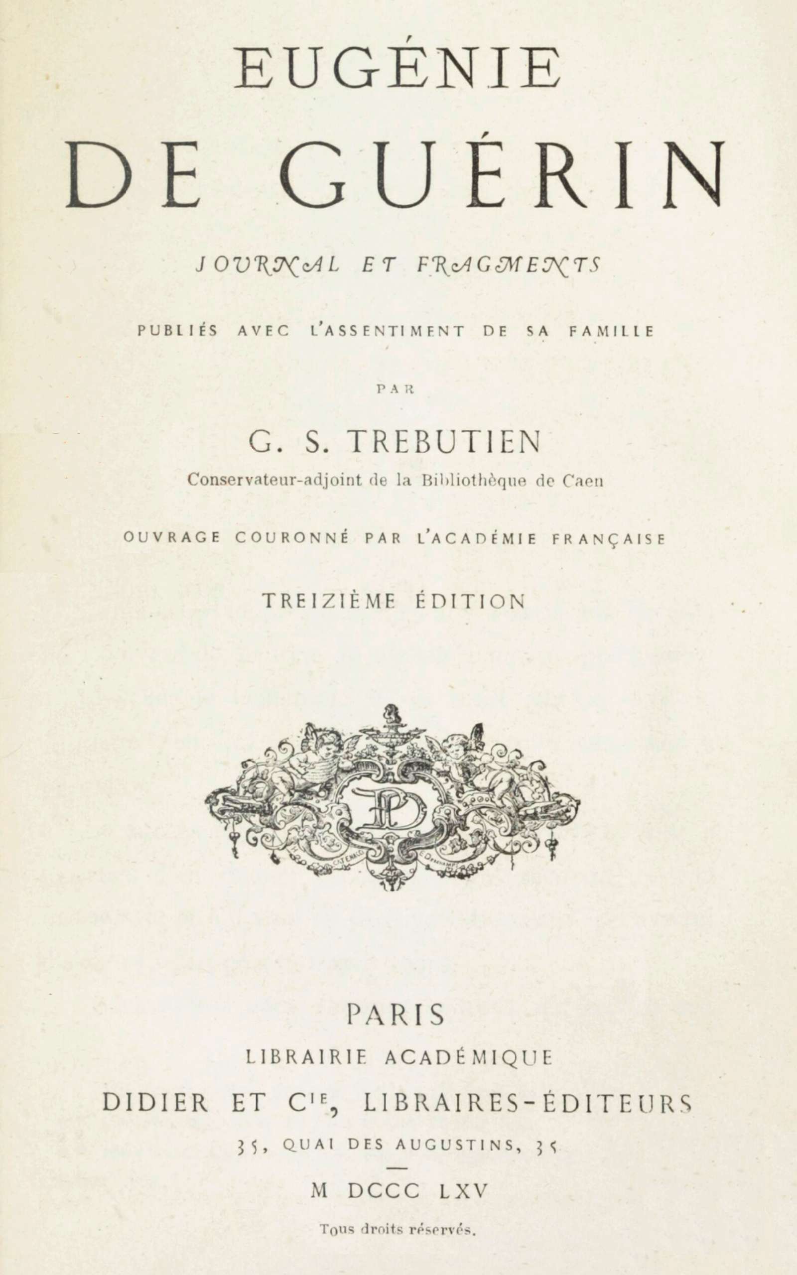 Huit éditions épuisées en seize mois ; les éloges spontanés et unanimes de la critique, non-seulement à Paris, mais dans toutes les provinces et à l’étranger ; enfin le suffrage de l’Académie française, ont consacré le succès du Journal de Mlle Eugénie de Guérin.