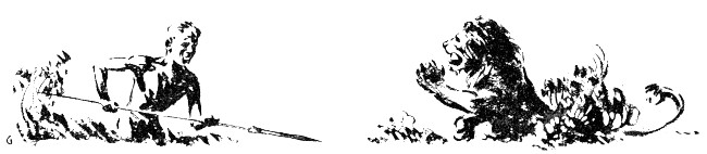"Lion!" he whispered. "He is coming! Take to the trees!"
