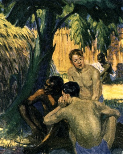 As everyone knows tar means white in the language of the great apes, and go means black, so Doc, with his light hair, was known as Tarzan-tar and Dick, whose hair was black, was called Tarzan-go. It was all right to be called Tarzan-tar and Tarzan-go, until the other boys began to make fun of them because they could climb trees no better than many another boy and, while they were fair in athletic sports, they did not excel. It was right there and then that Dick and Doc decided that they would live up to their new names, for they did not enjoy being laughed at and made fun of, any more than any other normal, red-blooded boy does.