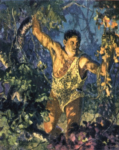 A giant white man, swinging through the trees, approached the camp of the fifty warriors. He was naked but for a leopard skin, and armed only with a long rope and a hunting knife. Through the darkness of the jungle, he moved with perfect sureness and in utter silence. Numa, the hunting lion, down wind from him, caught his scent and growled. It was a scent that Numa knew well, and feared.