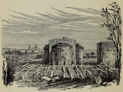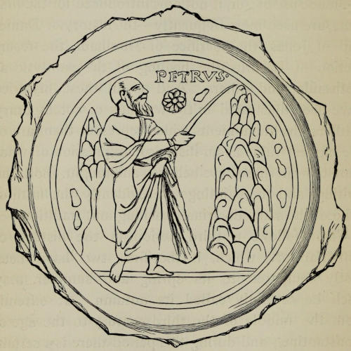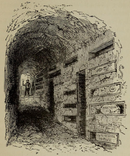 A few exceptions must be made to these remarks. To some cemeteries religious congregations of men or women had been attached from a very early date. These houses were established for the singing of the Divine praises day and night, in continuation of the primitive practice, when clergy and laity used to keep watch and sing psalms and hymns at the martyrs’ tombs. As long as this was done, the adjoining cemeteries remained at least partially accessible, and were preserved from utter oblivion. This is why we read of occasional visits to the Catacombs of St. Agnes, St. Cyriaca, St. Sebastian, and one or two others, even during the eleventh and twelfth centuries. Numerous inscriptions, which the making of the modern Campo Santo in Rome has lately brought to light, demonstrate that there was a convent of nuns near San Lorenzo fuori le mura, as early as the fourth century. There had been another at the Basilica of St. Agnes since the days of Constantine;[50] and Pope Sixtus III. established a congregation of men at the Basilica of St. Sebastian on the Via Appia. This last has an interesting connection with our subject; for the cemetery at St. Sebastian’s, which had been the temporary resting-place of the bodies of the Apostles Peter and Paul, was known as the Cemetery ad Catacumbas. How it came to be so called, or what is the meaning of the name, scholars are not agreed; neither would the settlement of the question add much to our knowledge of the Catacombs themselves, any more than if we could discover why another cemetery was called “The Cemetery at The Two Laurels” (ad duas lauros), and another, “The Cemetery at Cucumber Hill” (ad divum cucumeris). An accidental importance, however, attaches to the name of this particular cemetery, because it is now given also to all the other subterranean cemeteries of Rome, and even to the cemeteries of Naples, of Paris and Malta, of Sicily and Egypt, some of which have hardly any characteristics in common with them.