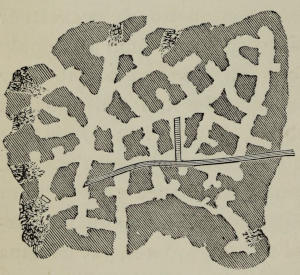 If we were sufficiently bold to leave the gallery which we first entered, and to pursue our way further into the interior, we should soon lose ourselves in some such labyrinth as is here represented. This diagram is a true map of a small portion (perhaps[5] not more than an eighth) of a catacomb on the Via Nomentana, commonly known by the name of St. Agnes. It is about 230 yards long by 180 in width; yet if all the galleries in this small section of a catacomb were stretched out in one continuous line, they would make very nearly two English miles in length. And then we must remember that in almost all these subterranean cemeteries the same thing is repeated on two or three different levels—in some of them even on five levels. In the Catacomb of St. Callixtus, on the[6] Via Appia, we can descend by a succession of staircases to five different stories, so to speak; and perhaps the excavators might have made even a sixth and a seventh had they not by this time come to the level of water, where any galleries they might dig would soon have become mere subterranean canals.