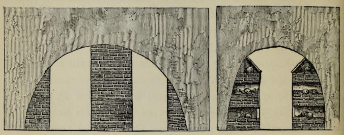 More than two centuries had now elapsed since the Catacombs were begun, and they had attained a[32] degree of development far beyond anything that could have been anticipated. Divers modifications also had been gradually introduced in the execution of the work, and of these it will be worth while to give some account. We will take the cemetery of St. Callixtus as a specimen; for although in almost every Catacomb there is some difference in detail from the rest, caused either by some local peculiarity, or by the mere taste or caprice of those who made it, yet, in outline at least, the process of development must have been the same in all. It seems to have been something of this kind. At first a plot of ground in some suitable situation was either given by its Christian proprietor, or acquired by purchase, and secured by all necessary legal formalities—probably also enclosed by a wall or other fence—as a place of burial. A plan of excavation was then determined upon, and the work begun. Whilst as yet the fossors had had no experience of the consistency of the material in which they were to labour, and whilst they imagined themselves to be providing for the burial only of a few, they would naturally work freely and without much regard to economy of space. But as time went on the necessity for economy would become apparent; then they had recourse to various devices for securing it. They lowered the floors both of the vaults and galleries, so that they might receive more tiers of graves. They made the galleries somewhat narrower than before, and closer to one another. At the angles of their[33] intersection, where the friability of the rock would not admit of full-sized graves being cut, they made smaller graves for infants, that the space might not be wasted. They did the same also even in the shelves of rock which had been left as a necessary support between the several tiers of graves. Everywhere unnecessary labour was spared; no more soil was removed than was absolutely necessary for the purpose required. The graves were made wider at the head and shoulders, and narrower at the feet; and if two bodies were to be buried in a double grave (locus bisomus), the soil was excavated only in exact proportion, the feet of the one being generally laid by the head of the other.