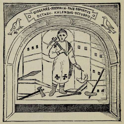 Other features in the development of the architecture of the Catacombs must be passed over, as they cannot be appreciated except by means of a personal examination on the spot, or with the aid of more abundant plans and drawings than our present limits will allow. We must not, however, omit to say a few words about the noble band of workmen by[35] whom these stupendous excavations were being made. We learn something about them even from the Catacombs themselves. Here and there, among the decorations of some of the vaults, may be seen the figures of men armed with pickaxes and lamps, and other instruments necessary for subterranean excavation, and several epitaphs have preserved to us the official title of these men: they were called fossores, or diggers. Their work must have been extremely laborious, and hence, in the imperial laws of the fourth and fifth centuries, they appear under a name derived from this circumstance. They are there called copiatæ, or labourers par excellence; but in all the inscriptions hitherto discovered in the Catacombs, they never have any other name than fossores, or fossarii. Their life must also have been one of continual danger and self-sacrifice. It was no mere venal service which they rendered to the Church, but a work of real devotedness. Moreover, they were necessarily in the confidence of the Church’s rulers; they knew the exact place of burial of each martyr and confessor, the times and places appointed for the celebration of the holy mysteries, and so forth. We are not surprised, therefore, to hear, on the authority of St. Jerome, that they were reckoned among the clerics; and although they are not mentioned in the list of the Roman clergy sent to St. Cyprian about A.D. 240, we find them enumerated in an official document of the first decade of the fourth century, where they follow immediately after the[36] bishop, priests, deacons, and sub-deacons. In the list furnished to St. Cyprian, it is probable that they are included among the ostiarii, with whose duties their own must have been in part identical as long as the Christians continued to worship in the Catacombs. However, be this as it may, there can be no doubt that during the earliest ages of the Church the fossors were supported, like the rest of her ministers, by the voluntary gifts of the faithful; and the whole work of the Catacombs was carried on by means of the mutual spontaneous liberality of the whole body of Christians, not by any fixed tax exacted for each grave that was required.