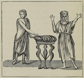 Then follows a third period in the history of Christian art, which, if the first two have been justly compared to its spring and summer, may itself be certainly called its autumn. It extends from the middle of the third century to the age of Constantine; and during this period there is a certain falling off of leaves, accompanied by a further development of the flower, without, however, any addition to its beauty. The symbolical element is sensibly diminished; what we have ventured to call Christian hieroglyphics are almost or quite abandoned; the parables also are less used, and even the historical types are represented in a more hard and literal form.[100] If Moses is still seen striking the mystical rock, the literal or historical Moses is at his side, taking off his shoes before drawing near to the burning bush; or the Jews are there, in their low round caps, drinking of the waters; or if it is desired to keep the mystical sense of the history before the people, it is deemed necessary to inscribe the name of Petrus over the head of Moses, as we see in two or three specimens of the gilded glasses found in the Catacombs, and belonging probably to the fourth century. Christ no longer appears as the Good Shepherd, but sits or stands in the midst of His Apostles, or, still[101] more frequently, miraculously multiplies the loaves and fishes. The fish is no longer the mystical monogram, “containing a multitude of mysteries,” but appears only as a necessary feature in the representation of this same miracle. Lazarus appears swathed like a mummy, in accordance, as we know, with the fact; but earlier artists had idealised him, and made him rise from the tomb young, free, and active. The three children refusing to adore the image set up by Nabuchodonosor are brought forward, and placed in juxtaposition with the three wise men adoring the Infant Jesus, suggesting a comparison, or rather a contrast, very suitable to the altered circumstances of the times.