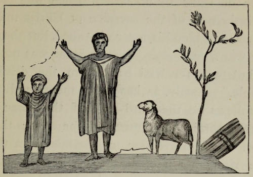 Such is the full meaning of the scene at the Sea of Tiberias, as interpreted according to the unanimous consent of the Fathers; and the adjuncts of this picture show that it was intended to be so understood[88] here also; for on one side is the figure of the consecration already described; and on the other, the sacrifice of Isaac by his father, which was surely a most lively type of the sacrifice of Christ upon the altar; wherein blood is not really shed, but the Lamb is only “as it were slain,” just as Isaac was not really slain, but was received back from the dead, “for a parable.” Lastly, as has been mentioned before, there follows on the third wall of the same chamber the natural complement of the rest; the doctrine of the Resurrection, as contained in the fact of the rising again of Lazarus. Thus, this whole series of paintings, executed at the end of the second century, or within the first twenty or thirty years of the third, and repeated (as has been said) in several successive chambers, was a continual homily, as it were, set before the eyes of the faithful, in which they were reminded of the beginning, progress, and consummation of their new and supernatural life.