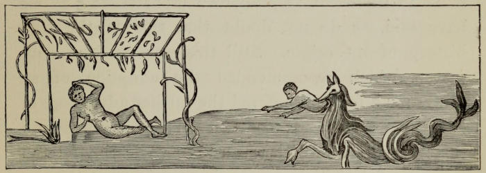The frequent repetition of the story of Jonas in a Christian cemetery needs no explanation, our Lord himself having put it forward as a type of His own resurrection, and so a pledge of ours also. The particular form, however, under which this story appears, was not suggested, as Noe’s ark was, by the place which it held in the cycle of Christian doctrine, but[92] rather by a certain Pagan model with which the Romans of that day were very familiar. The mythological tale of Andromeda, and the sea-monster to which she was exposed on the coast near Joppa (for so the story ran), was a favourite subject for the decoration of the walls in Roman villas, temples, and other public buildings. It may be seen in Pompeii, and, much nearer to the Catacombs, in Rome itself—e.g., in the barracks of one of the cohorts of the imperial police, discovered a few years ago in Trastevere; and in both places the monster is the precise counterpart of that which is always represented as swallowing or casting up Jonas; a kind of dragon, with large head and ears, a long slender neck, and a very tortuous body. Of course, in the infancy of Christian art, it was convenient to have a model at hand to represent an unknown monster, and, as we have said, we do not doubt that this is the true history of its origin. Still this was not the only reason which recommended the adoption of so grotesque a form; it offered the further advantage of creating as strong a contrast as possible between this “great fish,” which was a type of death, and the ordinary fish, which, as we have seen, was the recognised symbol of the Author of life.