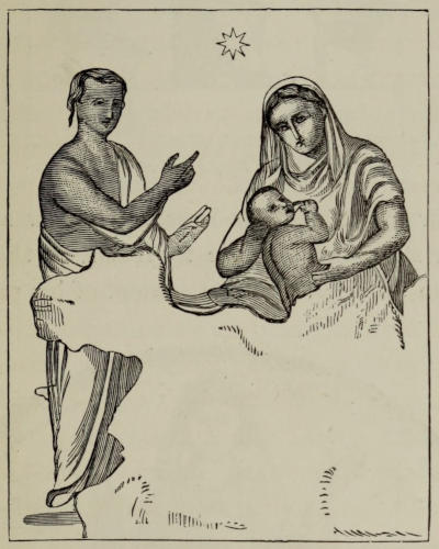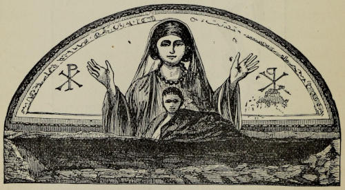 Our Blessed Lady appears principally in the scene of the Adoration of the Magi. Two, three, or four of these men (according to the arrangement of the group and the space at the artist’s disposal) stand in their Oriental dress, presenting their gifts to Christ who sits on Mary’s knee. Once or twice also the[96] Holy Child appears in His Mother’s arms, or before her breast, without reference apparently to any particular event in their lives, but either absolutely alone, or standing opposite to Isaias, as though presenting in themselves the fulfilment of his prophecies. One of these paintings in the Catacomb on the Via Nomentana belongs to the fourth century; but[97] for another of far higher artistic merit, to be seen in the Catacomb of St. Priscilla, the most competent judges do not hesitate to claim almost apostolic antiquity; and the claim is supported by many and weighty arguments. We cannot, however, discuss them here, for we have already exceeded the limits we had proposed to ourselves.
