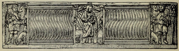 Our space will not allow, neither is it necessary, that we should enter at any length into the history of Christian sculpture, since the same general laws of growth presided over this as over painting. It must be remembered, however, that sculpture was used much more sparingly, and did not attain its full Christian development nearly so soon as the sister art. There was no room for it in the Catacombs except on the faces and sides of the sarcophagi, which were sometimes used there for the burial of the dead; neither was it possible to execute it with the same freedom as painting. The painter, buried in the bowels of the earth, prosecuted his labours in secret, and, therefore, in comparative security, without fear of any intrusion from the profane; but the work of the sculptor was necessarily more public; it could not even be conveyed from the city to the cemetery without the help of many hands, and it must always have run the risk of attracting a dangerous degree of general attention. We are not surprised, therefore, at hearing that some of those sarcophagi which are found in the most ancient parts of the Catacombs seem rather to have been purchased from Pagan[104] workshops than executed by Christians; those, for instance, on which are figured scenes of pastoral life, of farming, of the vintage, or of the chase, genii, dolphins, or other subjects equally harmless. Sometimes it might almost seem as though the subjects had been suggested by a Christian, but their Christian character blurred in the execution by some Pagan hand, which added a doubtful or unmeaning accessory,—e.g., a dog at the side of the shepherd. On some others there are real Pagan subjects, but these were either carefully defaced by the chisel, or covered up with plaster, or hidden from sight by being turned towards the wall.