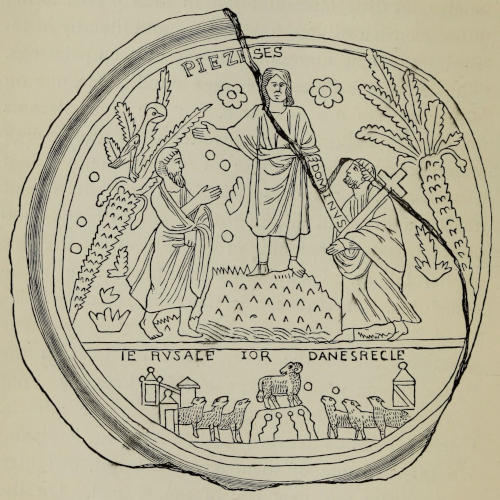 Representing Christ between SS. Peter and Paul; also Christ as the Lamb, and the faithful as Lambs—Jews and Gentiles coming from Jerusalem and Bethlehem (Becle) to Mount Sion, whence flow the four Evangelical Streams, united in the Mystical Jordan.