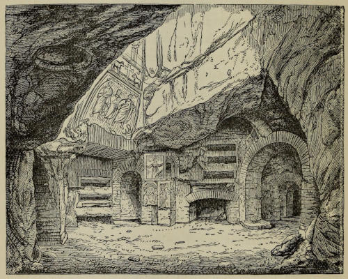 If we step forward and enter one of the doorways to be found on either side, it will introduce us to a small chamber, twelve or fourteen feet square perhaps. If there is nothing but graves cut in the walls of this chamber, just as in the galleries, we may safely conjecture that it was only a family vault. But if we[4] find a bench hewn out of the rock all round the room, together with a chair (or perhaps two) similarly excavated, we can hardly be wrong in supposing that the room was once used as a place of assembly, whether for purposes of public psalmody or of religious instruction. Or, if the principal tomb in the chamber be shaped like an altar, if two or three chambers open out of one another, and if one of these have an absidal termination, with a chair at the end and a low seat running round the sides, such as may still be seen in some of the old basilicas above ground for the accommodation of the bishop and clergy, no one can justly accuse us of rashness if we suspect that we stand in a place that was provided for the celebration of the Christian mysteries in days of persecution.