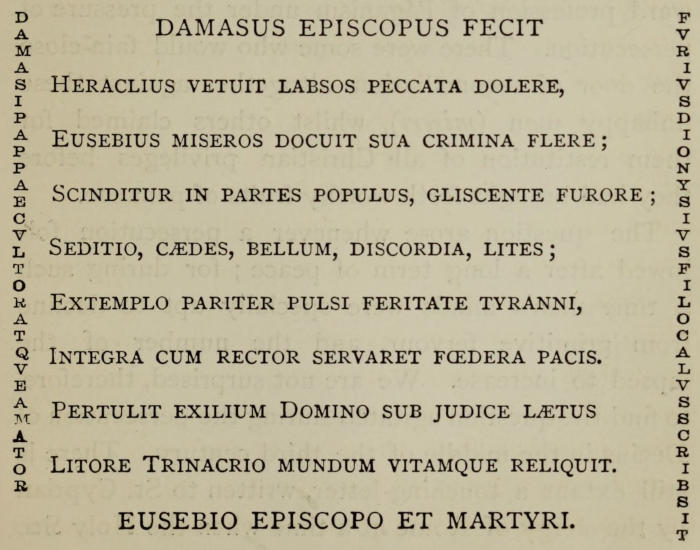 The question arose whenever a persecution followed after a long term of peace; for during such a time men’s minds were specially apt to decline from primitive fervour, and the number of the lapsed to increase. We are not surprised, therefore, to find the question agitated during the persecution of Decius in the middle of the third century. There is still extant a touching letter, written to St. Cyprian by the clergy of Rome at a time when the Holy See[155] was vacant after the martyrdom of St. Fabian, which clearly defines the tradition and practice of the Church. In it they say that absolution was freely given to those of the lapsed who are in danger of death, but to others only when wholesome penance has been exacted; and they declare that “they have left nothing undone that the perverse may not boast of their being too easy, nor the true penitents accuse them of inflexible cruelty.” The same question arose under the same circumstances in the persecution of Diocletian. Pope Marcellus was firm in upholding the Church’s discipline, but he was resisted with such violence that public order was disturbed in the city by the strife of contending factions, and the Pope was banished by order of the Emperor Maxentius. This we learn from another inscription of Pope Damasus, who says that he wrote it in order that the faithful might not be ignorant of the merit of the holy Pontiff. Eusebius was the immediate successor of Marcellus, and the epitaph now before us is clearly a continuation of the same history, ending in the same punishment of the Pope, as the reward of his contention for the liberties of the Church. For it should be remembered that these Popes were driven from their see and died in exile, not because they refused to apostatize, but because they insisted on maintaining the integrity of ecclesiastical discipline. They may justly be reckoned, therefore, among the earliest of that noble army of martyrs, who, from those days even to our own, have braved every danger rather than[156] consent to govern the Church in accordance with other than the Church’s rules.