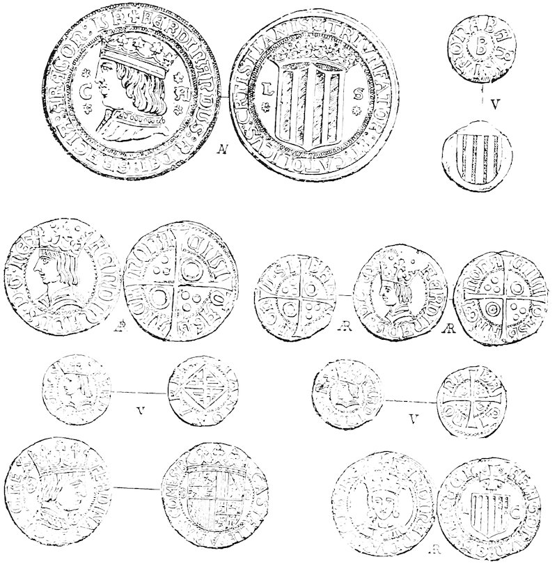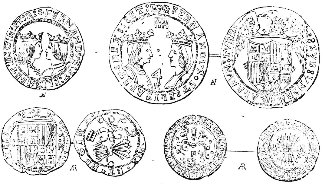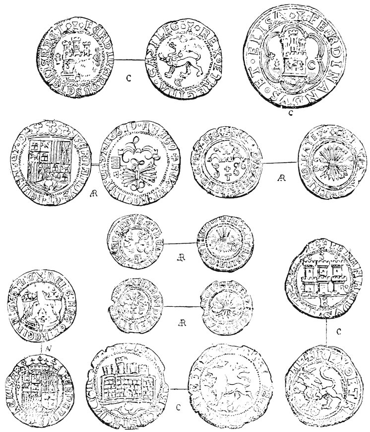 “Gold” and “ever more gold” was the popular cry; and Ferdinand and Isabel, in their eagerness that their new discovery should not enrich other nations, passed stringent laws forbidding the export of precious metals. The Spanish merchant, at the home frontier or harbour, must state from what locality he came, where he was going, and for how long, and how much coin he had with him;—his answers being written down and signed in the 399presence of three witnesses, that any subterfuge might afterwards be confuted. The foreign merchant had not even this indulgence. In exchange for what he imported from his own country he must take back neither coin nor bullion, however small the quantity, but exports in the form of goods manufactured in Spain; and these by a proclamation of 1494 might not include brocades nor embroideries woven or worked with gold thread.