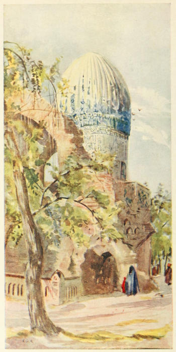 The Spanish historian, Clavijo, gives a vivid picture of the lady taking part at a great feast in honour of the wedding of Tamerlane’s grandsons. He says: “When the people were all arranged in order round the wall which encircled the pavilion, Cano, the chief wife of this lord, came forth to be present at the feast. She had on a robe of red silk, trimmed with gold lace, long and flowing. It had no waist, and fifteen ladies held up the skirt of it to enable her to walk. She wore a crested head-dress of red cloth, very high, covered with large pearls, rubies, emeralds, and other precious stones, and embroidered with gold lace. On the top of all there was a little castle, on which were three large and brilliant rubies, surmounted by a tall plume of feathers.... Her hair, which was very black, hung down over her shoulders, and they value black hair much more than any other colour. She was accompanied by 300 ladies, of whom three held her head-dress when she sat down, lest it should tilt over. She had so much white lead on her face that it looked like paper, and this is put on to protect[211] it from the sun, for when they travel (evidently Clavijo suffered in the same way as modern travellers when seeking information) in winter or in summer all great ladies put this on.” The palace one may very well believe, from what we can see of its remains, was a fitting background to such a gorgeous company. Its vast height and the brilliancy of the tiles make it one of the most impressive sights in Samarkand. The magnificent cupola is sadly broken, but the remains show that it is different from other cupolas in Samarkand, which were fluted and ovoid in shape, with blue tiles decorating them in fine contrast to the pearly whiteness of the remainder of the structure. The Bibi Khanum cupola is dome-shaped and entirely covered with the turquoise blue tiles so characteristic of Chinese architecture (in Shansi especially), and one likes to fancy it as a reminiscence of the princess’s native land. It is the most glorious note of colour, and at a distance, where the other tiles lose all their effect, it glows with undimmed beauty. It added value and charm to the various shades of blue in the great archway below it. In my sketch of the city I have tried to give this effect. The walls of the palace are sadly ruined, and it is to be feared that soon little will remain; the majestic archways can still be traced, and some fluted twisted columns of vivid blue are almost perfect, terminating below in an elegant design some feet above the ground. Hard by, but outside the precincts of the palace, another lofty tower stands erect, entirely covered with blue arabesques. Surely[212] such a wealth of beauty can be found nowhere else in the world.