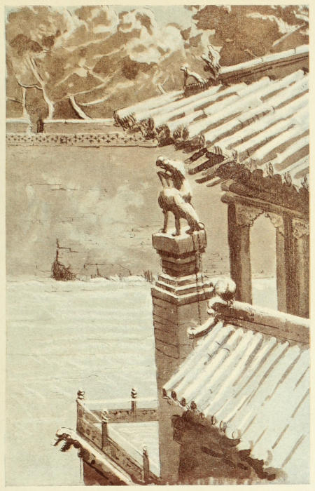 It was cold weather when we walked through[16] those fascinating streets, and in the fish shops we saw quantities of frozen as well as dried comestibles. Game was plentiful and cheap, and the frozen deer had quite a life-like appearance, standing waiting for a customer. In one street nothing but boots was being sold, and the fact was evident from afar, for outside the shops were hung gaily painted effigies of boots, some two feet in length. Above some shops were dragons, over others tigers, or the phœnix, or lotus blossoms all painted in every colour of the rainbow, and hanging from them signboards bearing the name of the shopkeepers. The cash shops have almost a screen of strings of gigantic cash dependent from the eaves. The curio shops still contain things to charm the soul of the artist, though every day sees their treasures diminishing, to be replaced by modern imitations. The glorious jade that used to be obtainable is scarcely to be found, and the bronzes have mostly been carried off to the West; still one hopes for the best, and carries off a few things, which if not so old as they boast to be, have at least an air of antiquity and some noble suggestion of the glory of the art of the Ming dynasty.