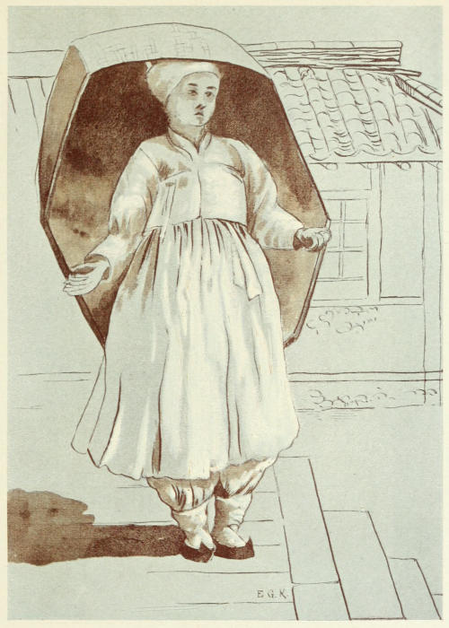 Noorhachu was buried in the Foo Ling tomb, east of Moukden, a fitting resting-place for the great founder of the Manchu dynasty. It was during his son’s reign that the Manchu dynasty was firmly placed[13] upon the throne of China in the person of Noorhachu’s grandson, a boy of five years old (1644). His father had been summoned by the Chinese to aid them against several hordes of rebels who had devastated the empire, and he sent a powerful army led by his brother. The Manchus, after defeating the rebel army, marched on Peking, where Li Dsuchung, the most noted rebel leader, had entrenched himself, and where the last of the Ming Emperors had in consequence committed suicide. Li Dsuchung had indeed proclaimed himself Emperor in his stead, but after a reign of one day he fled from the city at the approach of the Manchus, was pursued by them, and severely defeated. The Manchu general at once sent for his nephew—the ninth son of the reigning monarch, a child of five years old—and placed him upon the throne, himself acting as Regent. The new Emperor received the title of Ta-tsing, or “Great Pure”—the name of the present dynasty. The Regent was an able ruler, and soon succeeded in dispersing the rebels and restoring order throughout the empire. At the end of six months comparative peace had been established, and the Regent issued a proclamation that all who submitted to the new rule would enjoy the same rank, position, and emoluments, as they had done under the Ming dynasty.[2] He ordered sacrifices to be offered at the Ming tombs, and that a tomb should be erected[14] for the last of them, where sacrifices should also be offered. He postponed the enforcement of the humiliating law requiring change of dress, the shaving of the head, and wearing of the queue and Manchu cap, and he promised those who complained of the neglect of etiquette and music among officials, that proper attention should be given to this matter as soon as war was at an end. It is an interesting fact that the Manchus should afterwards have so completely succeeded in imposing their dress on the Chinaman, the wearing of the queue becoming universal; but equally interesting is it to observe that the women never could be made to adopt it. The Manchu woman’s dress is to this day quite different from the Chinese, from its wonderful wing-like head-dress down to its large shoes. The Chinese woman refused to unbind her feet, and was in consequence never admitted within the precincts of the palace at Peking. In fact it may be stated that whereas it is impossible to distinguish between a Chinaman and a Manchu, there is no part of a Chinese woman’s dress which is quite the same as a Manchu’s. The latter have different styles of arranging their hair from the spreadeagle style, so commonly seen in Peking, to the curious one shown in the sketch (see next chapter), and also wear different kinds of shoes—some with a heel attached to the centre of the sole, others with a flat white sole some two inches thick.
