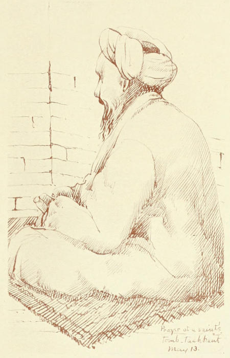 We were shown the great Koran, a gigantic volume to suit the size of the lectern in Bibi Khanum’s madressah. The famous original was carried to St. Petersburg after the taking of Samarkand by the Russians, but this is said to be a fine sixteenth-century[217] copy of it. There were relics of the saint pointed out to us behind a screen, but we could not make out what they were, and we were shown the beautiful carpet, a fine specimen of those made in Turkestan. Banners of red, blue, and green hang over these treasures, and under them the guardian of the shrine sat down, intimating that he was now prepared to receive a gift. To judge by his attitude he thought it would be a lordly one, but there is always a strange discrepancy in the East between the magnitude of the gift and the air with which it is received. In various nooks and corners people lay curled up asleep, or were drowsily repeating their prayers. While I sketched our two guides were evidently discussing our merits, and at last one inquired if we were Russians, and on hearing that we were not they wanted to know whether we liked the Russians, making it abundantly plain that they did not. Nevertheless they acquiesce without much apparent feeling to the yoke of the foreigner, no doubt accepting it as “Fate.”